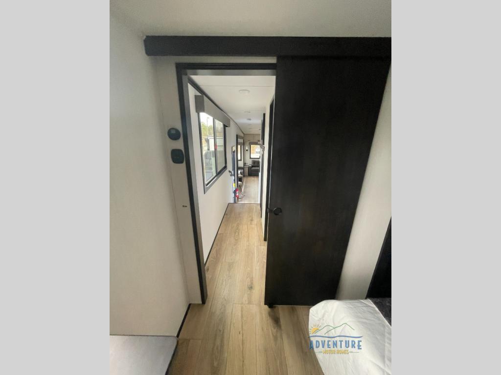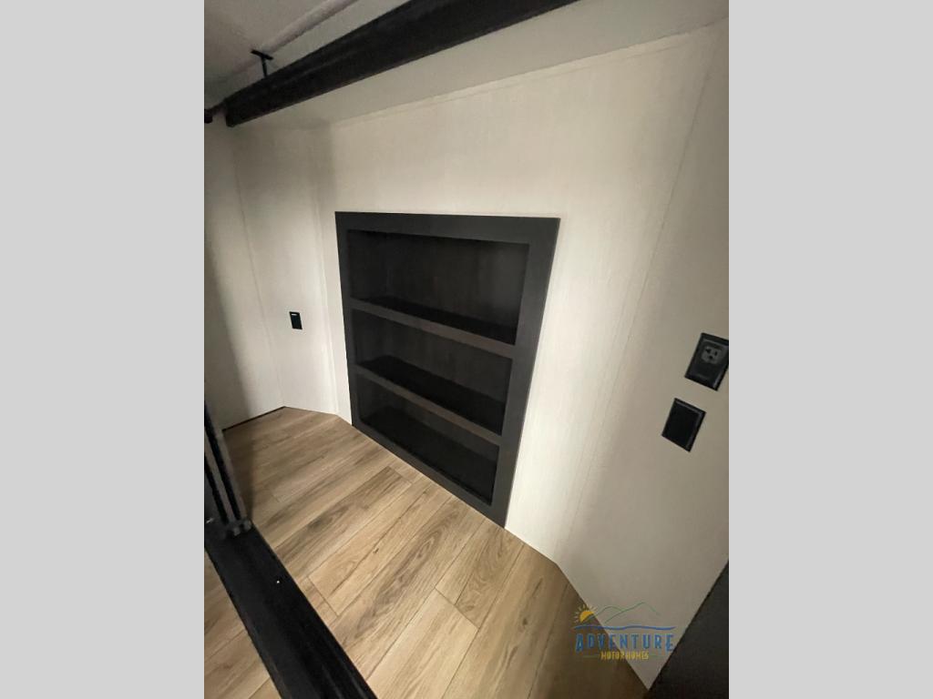 Cook like a chef worthy of a Michelin star in this amazing fifth wheel! Inside, you'll find a spacious rear kitchen, complete with a pantry, a 12V refrigerator ideal for keeping your fruits and vegetables fresh, overhead cabinets, and a sprawling countertop for all your cooking and dining times. The high-top table and chairs provide the perfect place to enjoy meals with family and friends. The living room is a cozy place featuring comfortable theater seating, a tri-fold sofa, a cozy fireplace, an entertainment center, and a convenient desk for staying productive on the go. The full bathroom is also a great place to freshen up, complete with a linen closet and all the amenities you need to take a bath and feel at home. With a spacious shower and plenty of storage, you'll have everything you need to start your day off right. The perfect place to rest and recharge after a long day of adventure is the front bedroom which boasts a comfortable king bed, dresser, walk-in wardrobe with washer and dryer prep. Outside, you'll appreciate the pass-through storage for all your gear and toys, as well as the two awnings ideal for creating unforgettable memories outside without worrying about the weather.