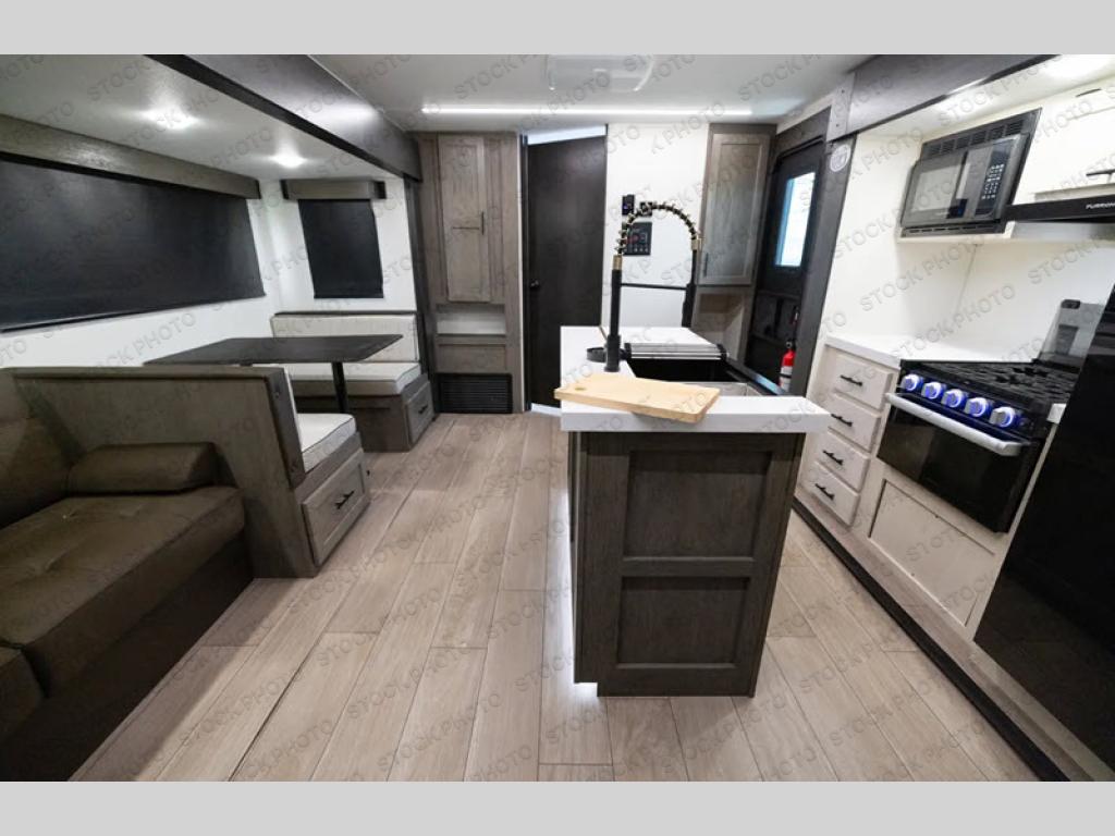 Load up your clothes, food, and outdoor gear to enjoy a long weekend away from the city in this travel trailer! There are triple slide outs, a private bunkhouse with a half bathroom with a second exterior entry/door for convenience, plus an outside kitchen! The bunkhouse also has two bunks, a jackknife sofa and a trundle bed, plus a slide out for more interior floor space. The main living and kitchen area is spacious as well with two opposing slides, a kitchen island with a large sink, a pantry, plus a cozy fireplace. The full walk-through bathroom allows double access, and the front bedroom allows you to sleep like royalty.