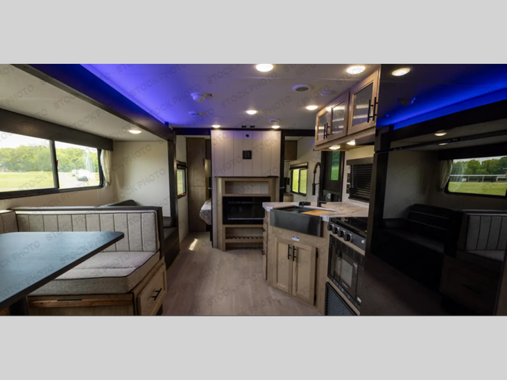 Come on inside this Cherokee Grey Wolf travel trailer and experience the convenience of a smooth flow of traffic in and out with two entry doors. The rear door leads into a full bath which is great for accessibility. Once inside, you will notice the large U-shaped dinette and the sofa which sit on the slide and create a spacious footprint for moving about, as well as great places to play games and socialize with your friends and family. A walk-in pantry provides plenty of storage allowing you to stock up on your favorite snacks and dry goods for your family adventure. At night, there is sleeping space for everyone between the double-size bunks and the RV king bed, plus the furniture.