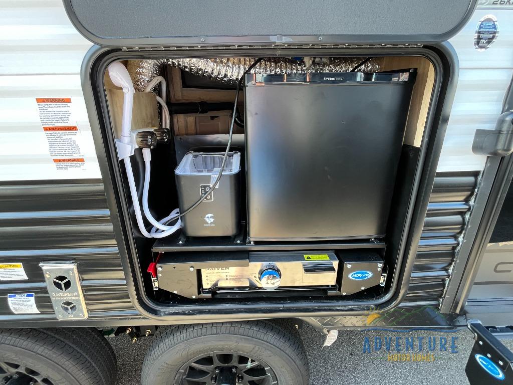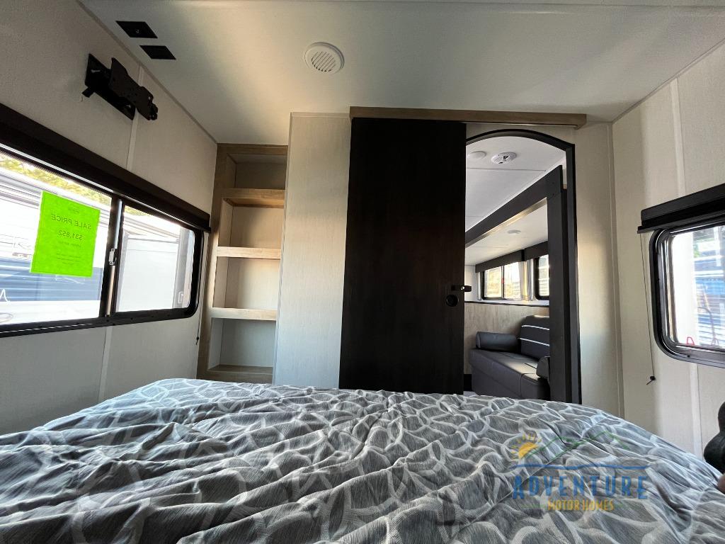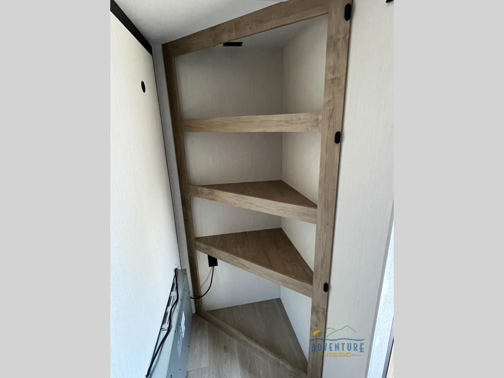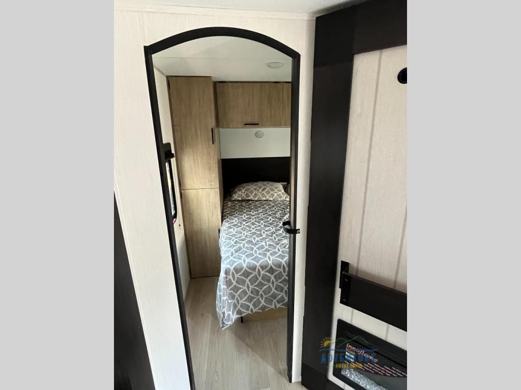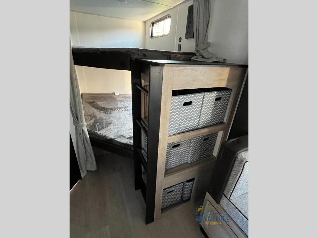 If you've been searching for a travel trailer with a larger sleeping capacity to camp with friends, this is the one! There are double-size bunks in the rear corner, and the full bath with its own exterior entry door is in the other rear corner for easy nighttime use. Up front, an RV king bed in the private bedroom is sure to bring a great night's rest, and you'll find dual bedside wardrobes to keep your clothes picked up off of the floor. In the morning, everyone can meet in the main living room that includes a large slide out, U-shaped dinette, sofa, and a fireplace with a hidden pantry behind it for smart storage solutions. There is also a TV mount here for the option to bring along your television. An outside mini kitchen will allow you to get some fresh air as you make dinner, but there's also a full interior kitchen if the weather isn't cooperating. Additional outdoor features include a rear storage rack, an outside TV mount, and a 9' power awning for some shade!