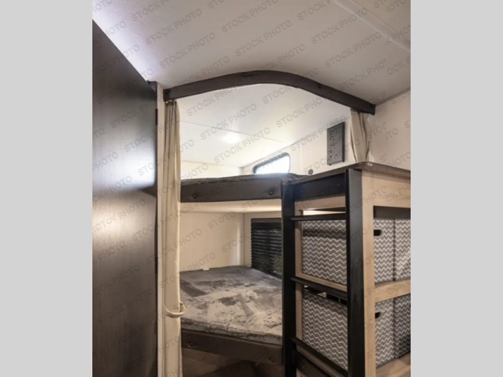 If you've been searching for a travel trailer with a larger sleeping capacity to camp with friends, this is the one! There are double-size bunks in the rear corner, and the full bath with its own exterior entry door is in the other rear corner for easy nighttime use. Up front, an RV king bed in the private bedroom is sure to bring a great night's rest, and you'll find a bedside wardrobe to keep your clothes picked up off of the floor. In the morning, everyone can meet in the main living room that includes a large slide out, U-shaped dinette, sofa, and a fireplace with a hidden pantry behind it for smart storage solutions. An outside kitchen will allow you to get some fresh air as you make dinner, but there's also a full interior kitchen if the weather isn't cooperating. Additional outdoor features include a rear storage rack, an outside TV mount, and a 15' awning for some shade!