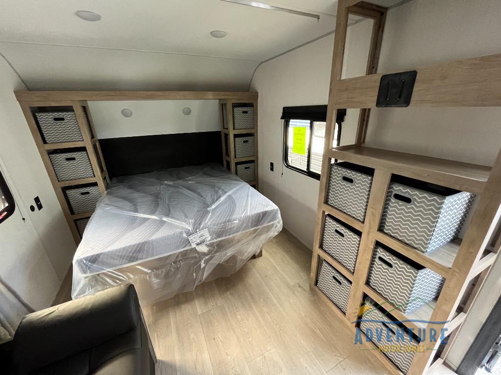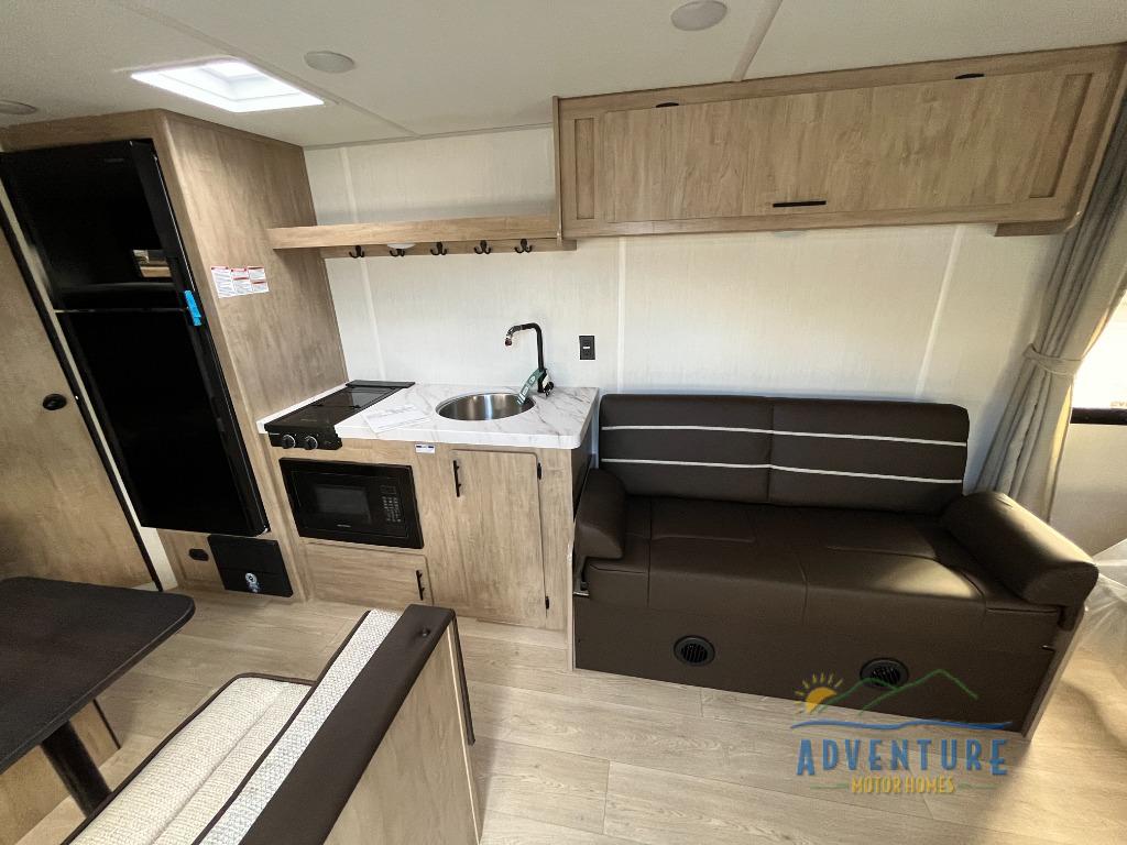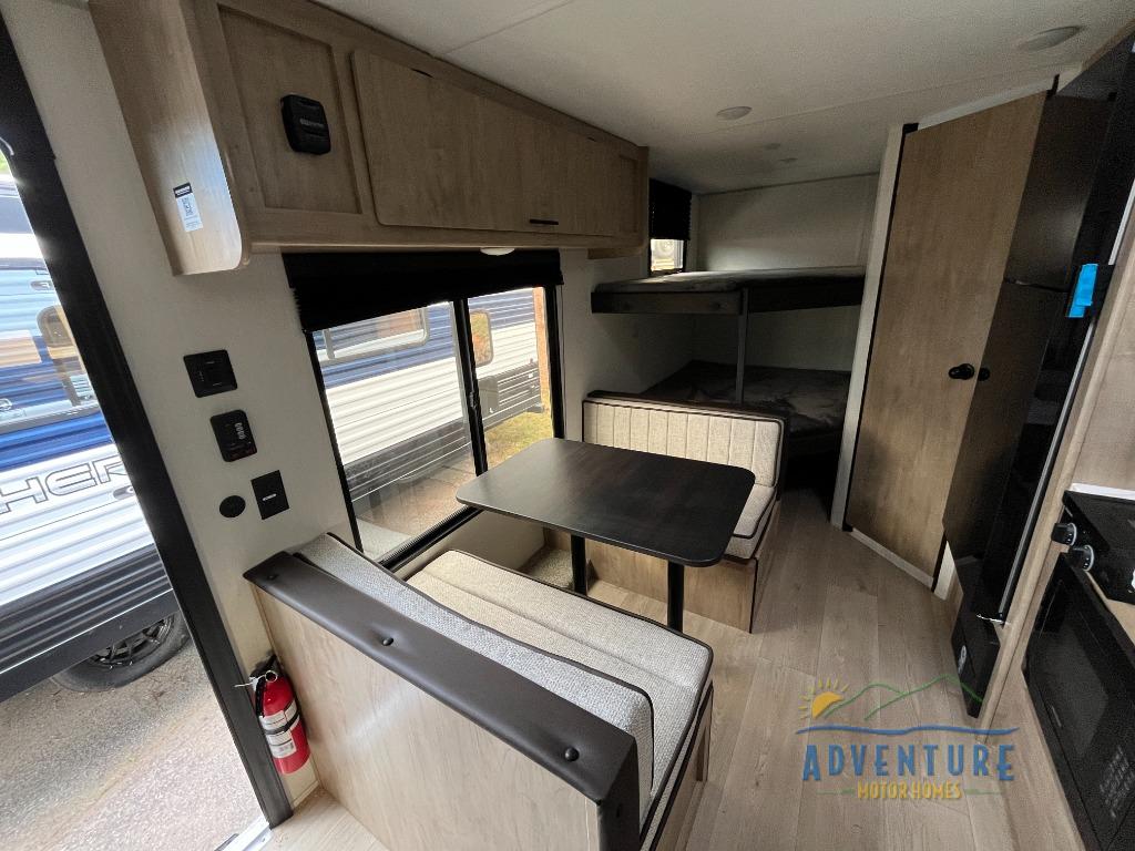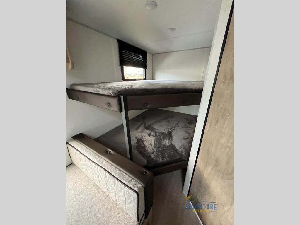 The double-size bunks in this model will allow you to camp with more friends and family! With the additional queen bed up front, plus the sofa and booth dinette, you can sleep eight! A full kitchen lets you make meals each day, and the full bath includes a tub/shower so you can clean up after hiking. This unit also includes USB ports to keep your electronics charged, and outside storage for your camp gear!