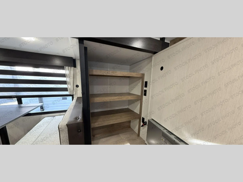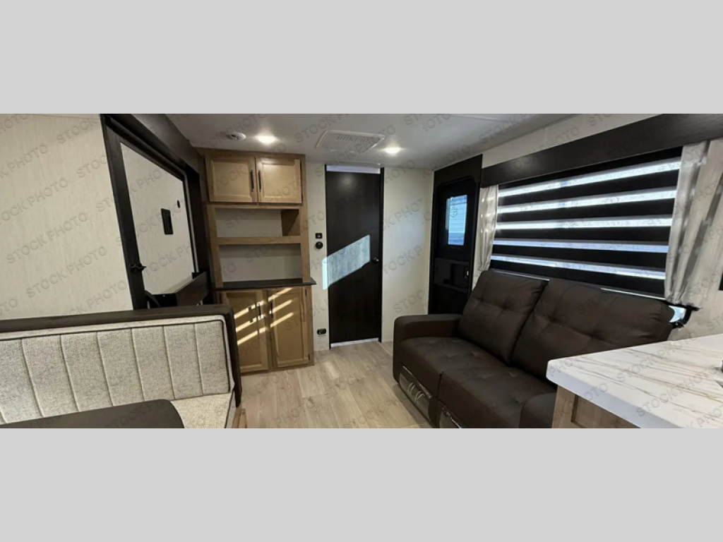 You'll love every minute spent in this single slide out travel trailer, whether you're cooking dinner on the outside kitchen or in the rear kitchen, relaxing on the sofa across from the fireplace, or sleeping on the RV king bed in the front master bedroom! There are hidden shelves behind the fireplace for convenient storage, and the booth dinette within the slide provides a place to dine together. The walk-thru bath is spacious, and includes a tub/shower, toilet, and sink with counter space.