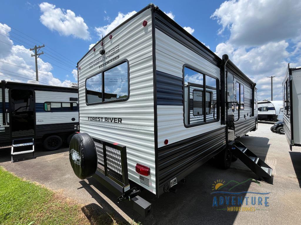 Whether it's a journey that will take you to new locations or a tried-and-true getaway to that favorite and memorable destination, the Forest River Cherokee Grey Wolf travel trailers and toy haulers are going to make the trip worth it every single time! You can travel in confidence with the premium wheel package, seamless roofing membrane with heat reflectivity, Power Gear frame technology with space-saver rail design, and Cherokee back-up camera system. The Cherokee Grey Wolf's interior is highly attractive with its stainless steel kitchen suite package and premium bedding ensemble and comforter. You will also find a black waste tank flush-out kit, an outside shower with hot and cold water, an armored underbelly tank enclosure, and an RV grill quick connect.