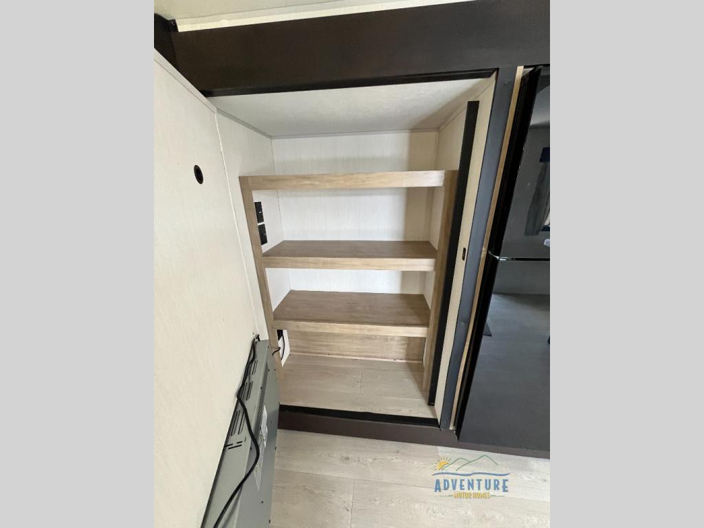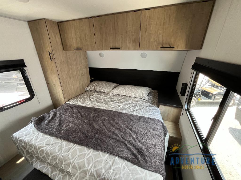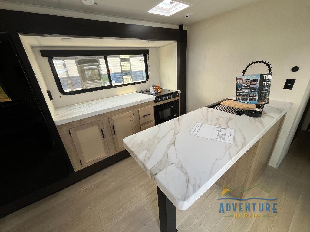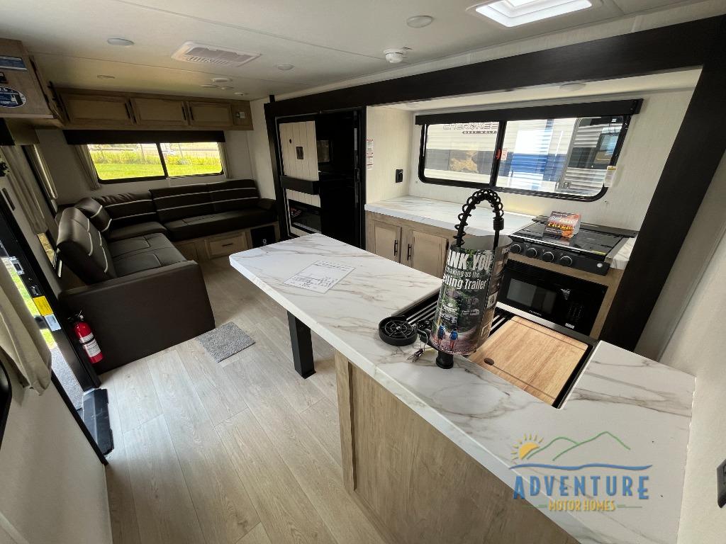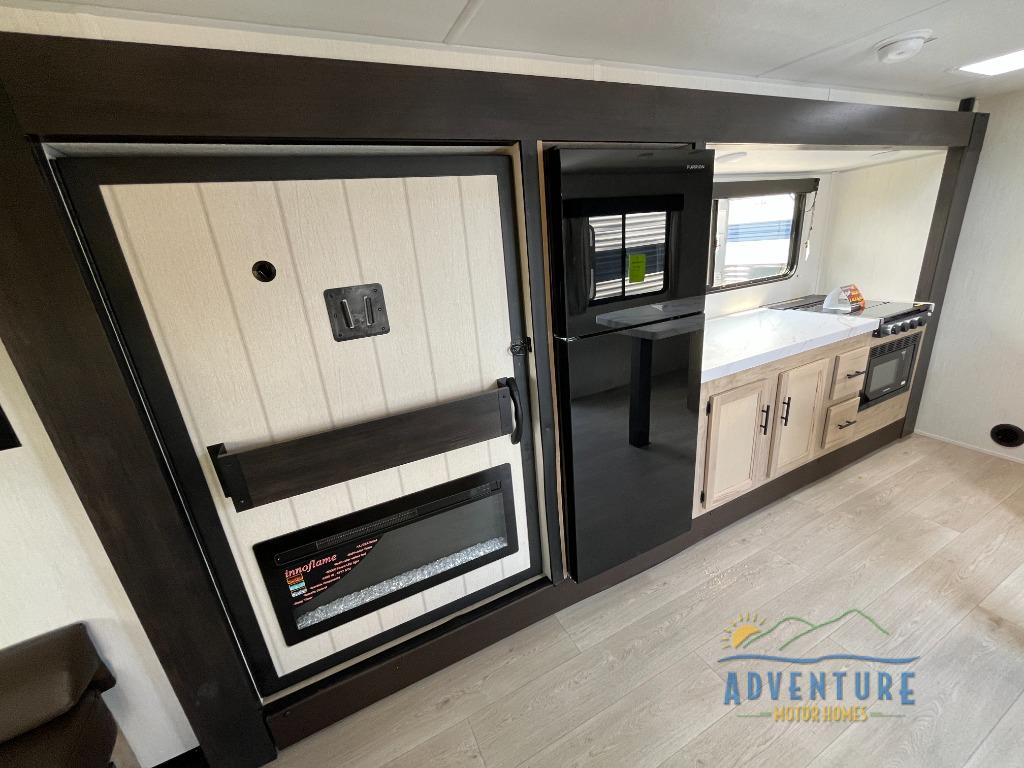 This travel trailer will feel just like home with its RV king bed in the front bedroom plus the full bath with a tub/shower, and there is a spacious living area thanks to the large slide out. Here, you'll find the air fryer and counter space, 12V refrigerator, and the fireplace with a hidden pantry behind it. Your crew can relax on the L-shaped sofa, or visit with the chef while they prep meals at the island peninsula. There are even two bar stools here for added convenience. Head outdoors to enjoy the power awning with LED lights in the evening!