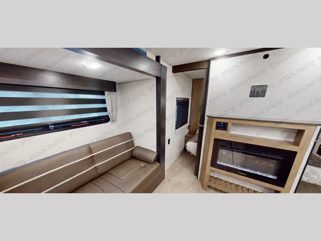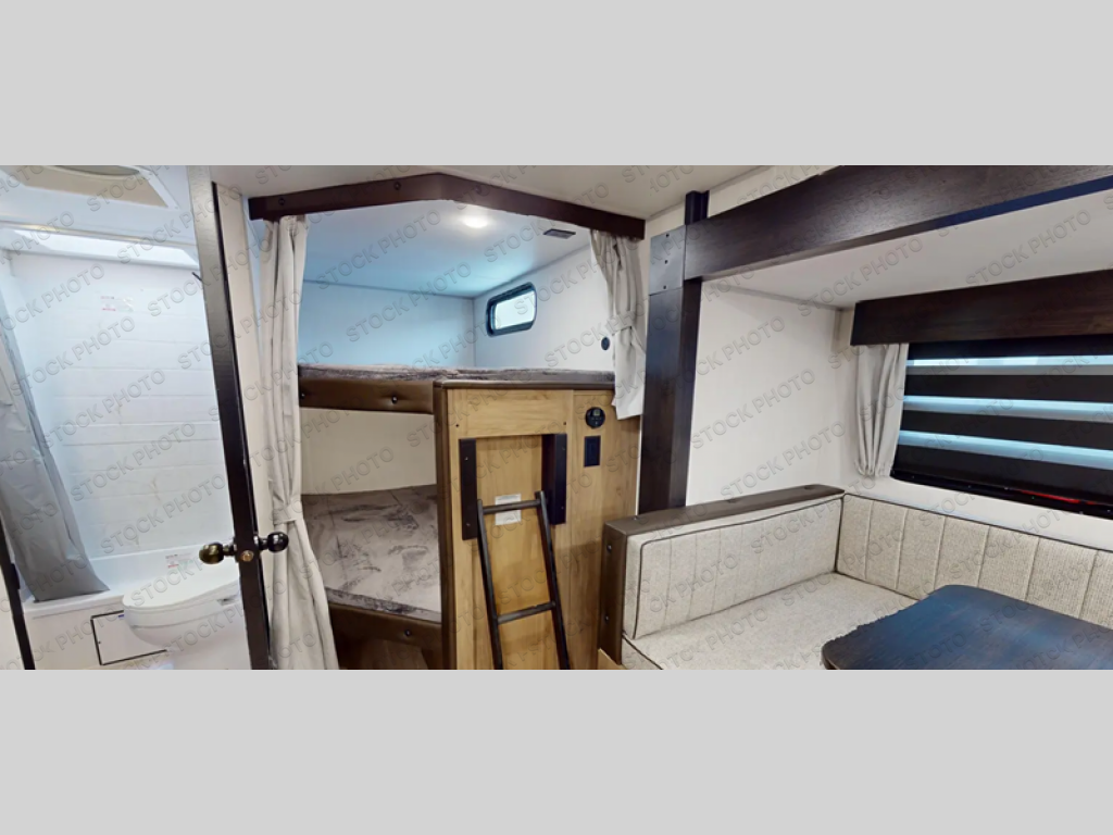 Come on inside this Cherokee Grey Wolf Black Label travel trailer and experience the convenience of a smooth flow of traffic in and out with two entry doors. The rear door leads into a full bath which is great for accessibility when outside and when you need to use the bathroom. Once inside, you will notice the large U-shaped dinette and the sofa which sit on the slide and create a spacious footprint for moving about, as well as great places to play games and socialize with your friends and family. A large pantry provides plenty of storage allowing you to stock up on your favorite snacks and dry goods for your family adventure. At night, there is sleeping space for everyone between the double-size bunks and the RV king bed, plus the furniture.