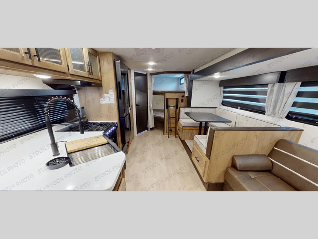 Come on inside this Cherokee Grey Wolf Black Label travel trailer and experience the convenience of a smooth flow of traffic in and out with two entry doors. The rear door leads into a full bath which is great for accessibility when outside and when you need to use the bathroom. Once inside, you will notice the large U-shaped dinette and the sofa which sit on the slide and create a spacious footprint for moving about, as well as great places to play games and socialize with your friends and family. A large pantry provides plenty of storage allowing you to stock up on your favorite snacks and dry goods for your family adventure. At night, there is sleeping space for everyone between the double-size bunks and the RV king bed, plus the furniture.