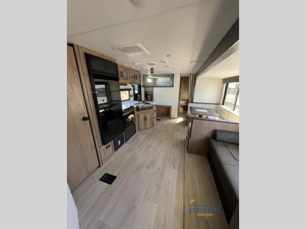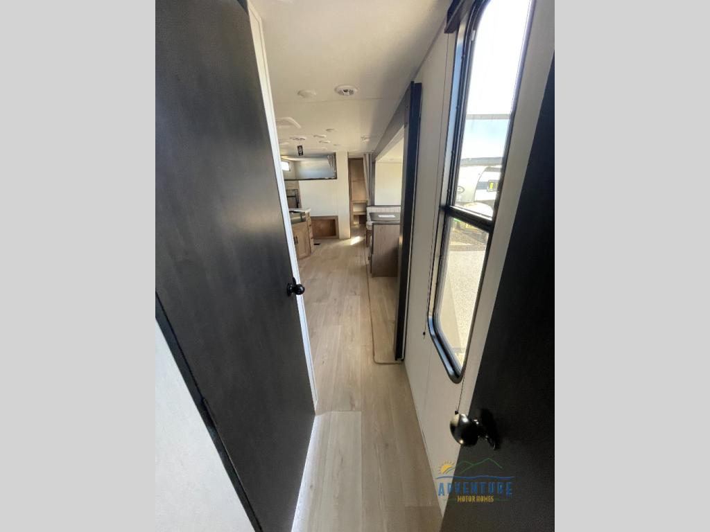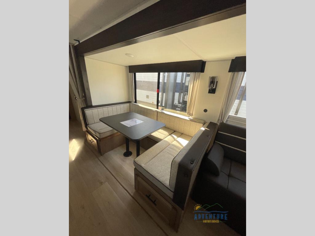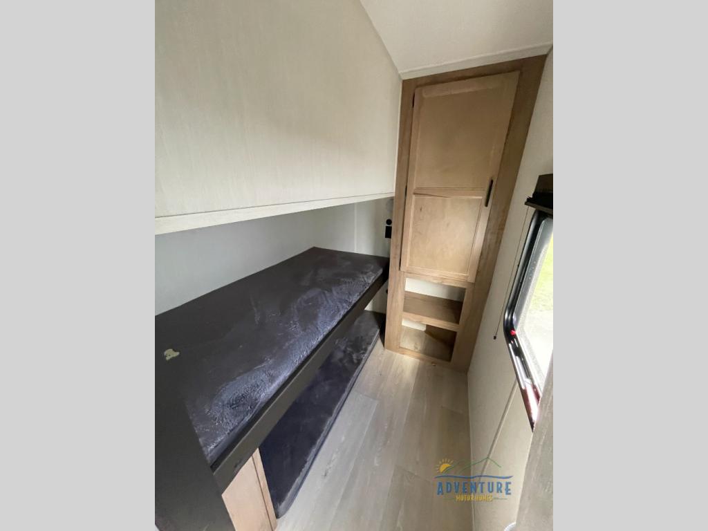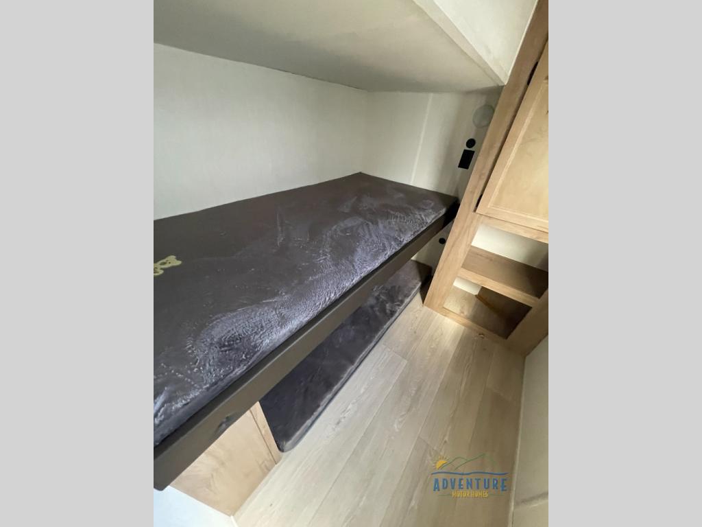 Escape your ordinary life with this innovative travel trailer! It features 64" top bunk bed above a 36" bottom bunk with wardrobes on either side of them, plus there is a wall at the foot of the beds with a fireplace on the other side. You will have your own privacy with the front private bedroom that has a walk-around RV king bed with a bedside wardrobe and an entrance into the dual entry bathroom which has a neo-angled shower to freshen up in each morning plus one of the dual entry doors to the unit. The sofa and U-shaped dinette can also transform into extra sleeping spaces when you aren't using them to enjoy a meal or relax. The outdoor bar and grill will let you grill up your best burger recipe, and you even have a rear storage rack and outside storage areas to store your outdoor gear!