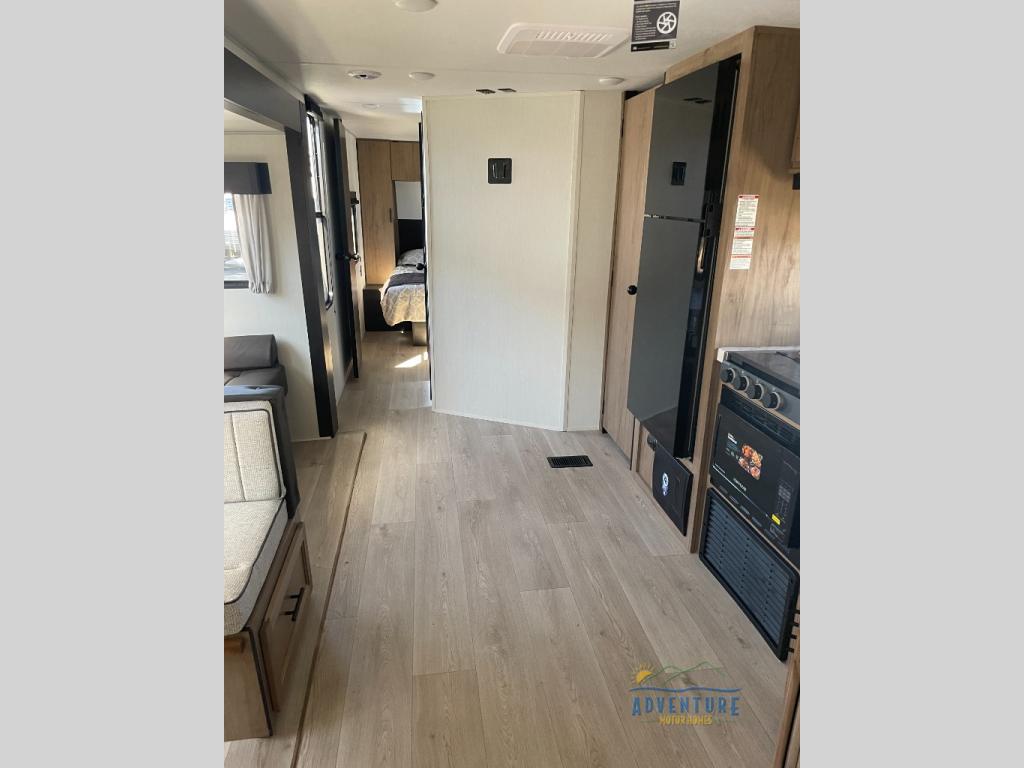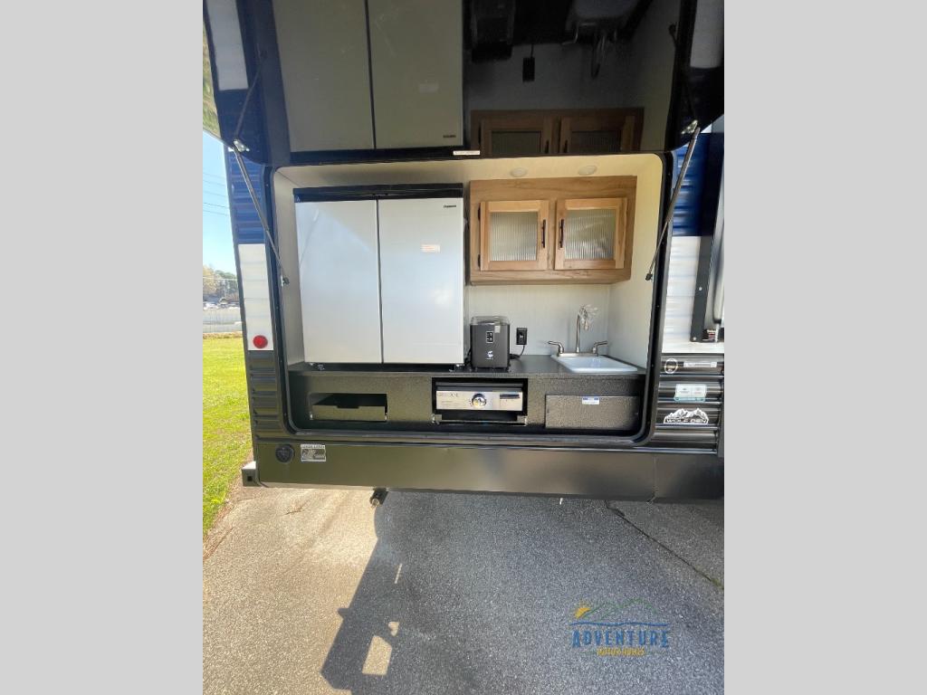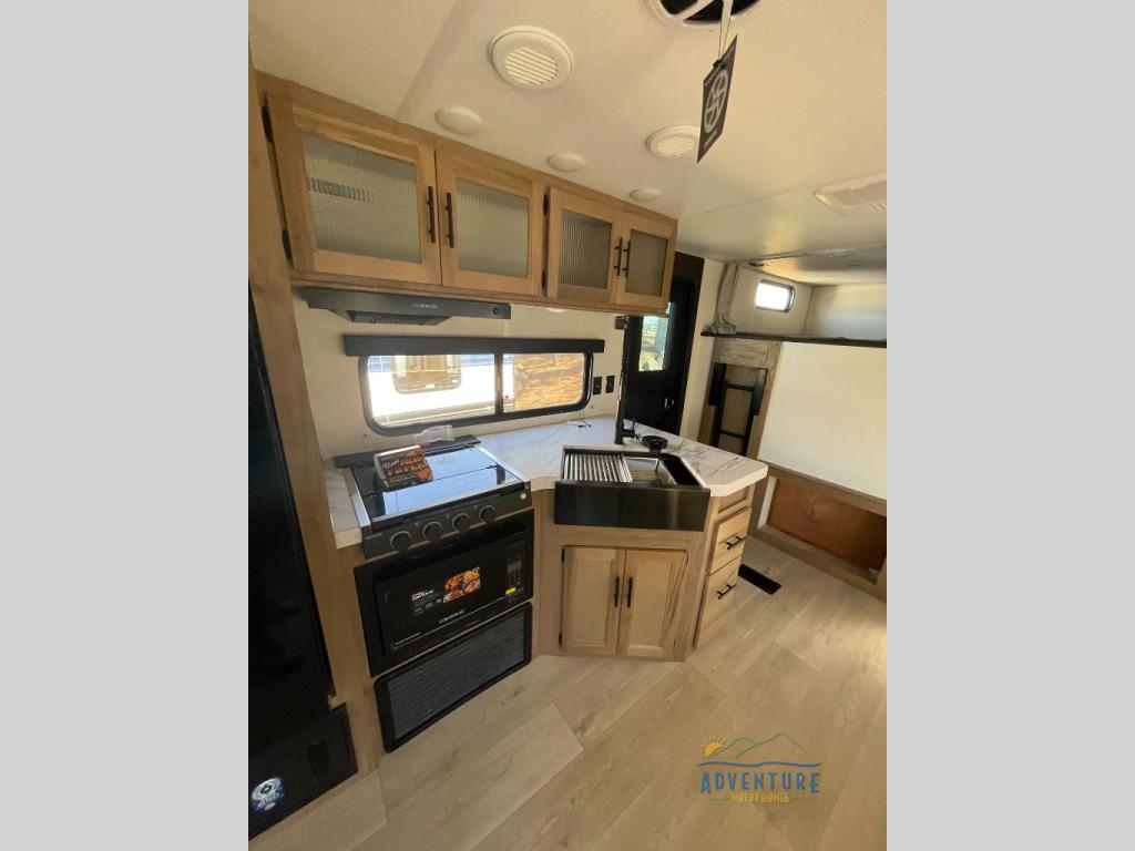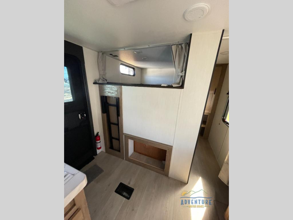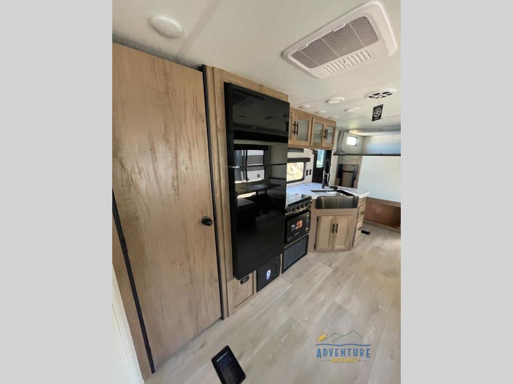 Escape your ordinary life with this innovative travel trailer! It features 64" top bunk bed above a 36" bottom bunk with wardrobes on either side of them, plus there is a wall at the foot of the beds with a fireplace on the other side. You will have your own privacy with the front private bedroom that has a walk-around RV king bed with a bedside wardrobe and an entrance into the dual entry bathroom which has a neo-angled shower to freshen up in each morning plus one of the dual entry doors to the unit. The sofa and U-shaped dinette can also transform into extra sleeping spaces when you aren't using them to enjoy a meal or relax. The outdoor bar and grill will let you grill up your best burger recipe, and you even have a rear storage rack and outside storage areas to store your outdoor gear!