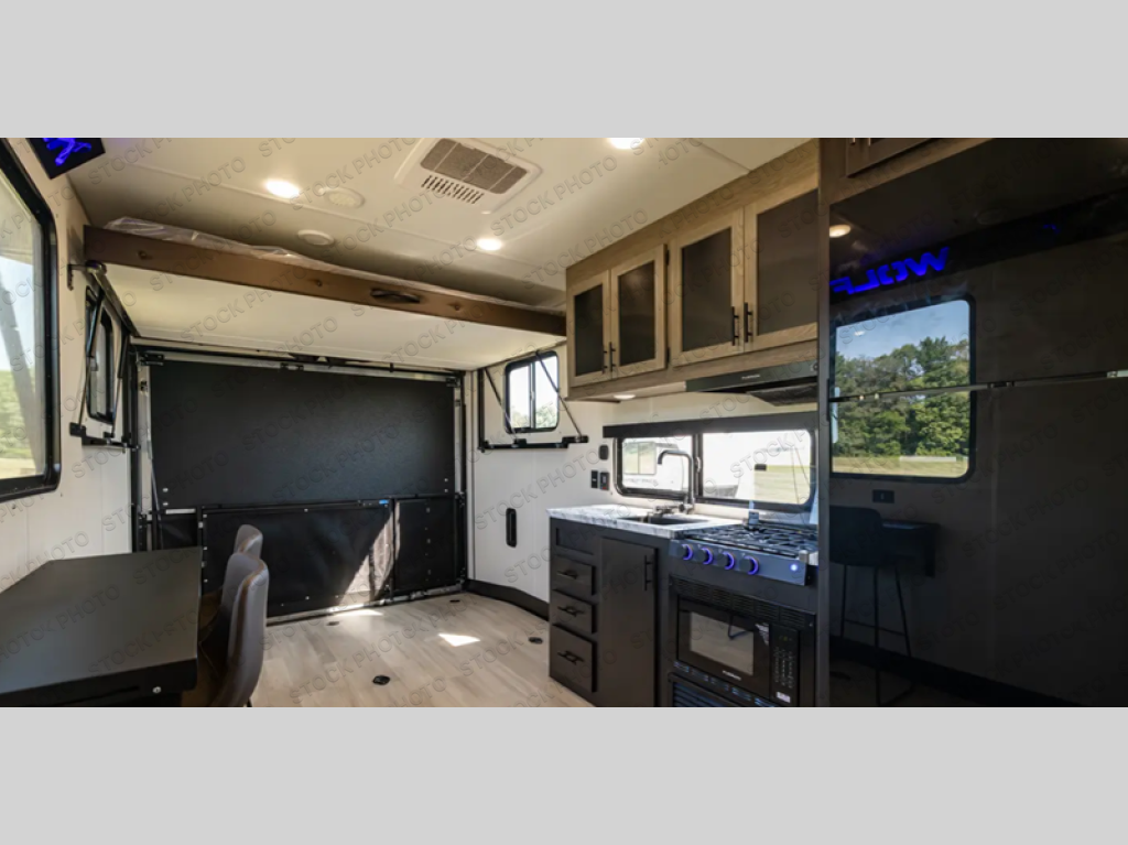 You can't go wrong when you have this toy hauler in tow! There is 14' 6" of cargo space for your toys, and an optional ramp door patio deck railing can be added if you want to turn the door into a patio. The three burner cooktop will allow you to make meals each day, and the flip-up counter with stools provides a place to dine at. You could also take your plate outdoors to eat under the 18' power awning with LED accent lighting. You'll sleep great each night on the RV king bed in the front bedroom, while your guests take the quick set bed system in the garage!