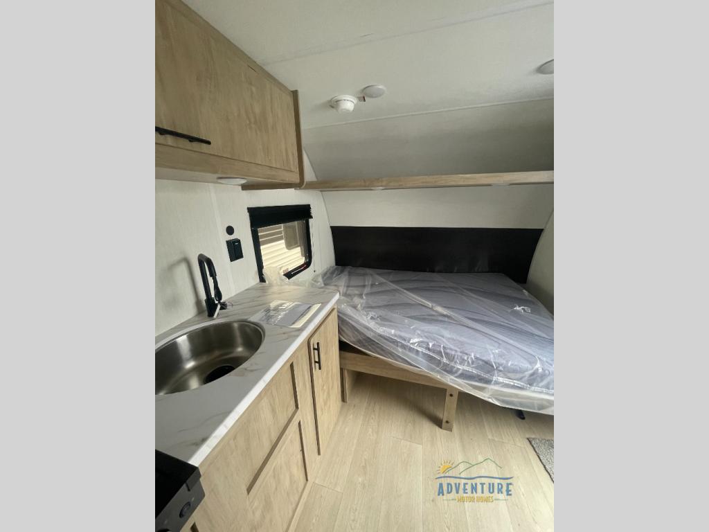 This travel trailer is perfect for epic road trips, memorable camping excursions, or rejuvenating getaways. The private bathroom is equipped with everything you need for a comfortable stay, providing a convenient spot to freshen up after a long day of exploring. The kitchen is equipped with a refrigerator for keeping drinks and ingredients fresh, and a microwave for quick reheating. The bunk beds are a great spot to take a nap or a kid's sleeping space. Overhead cabinets provide additional storage for cookware, dishes, and other essentials. In addition, the queen-sized bed provides a comfortable sleeping space, perfect for relaxing after a long day.