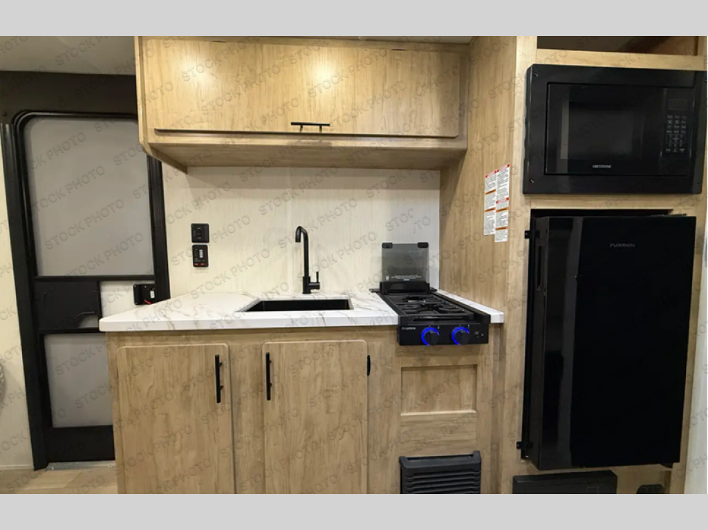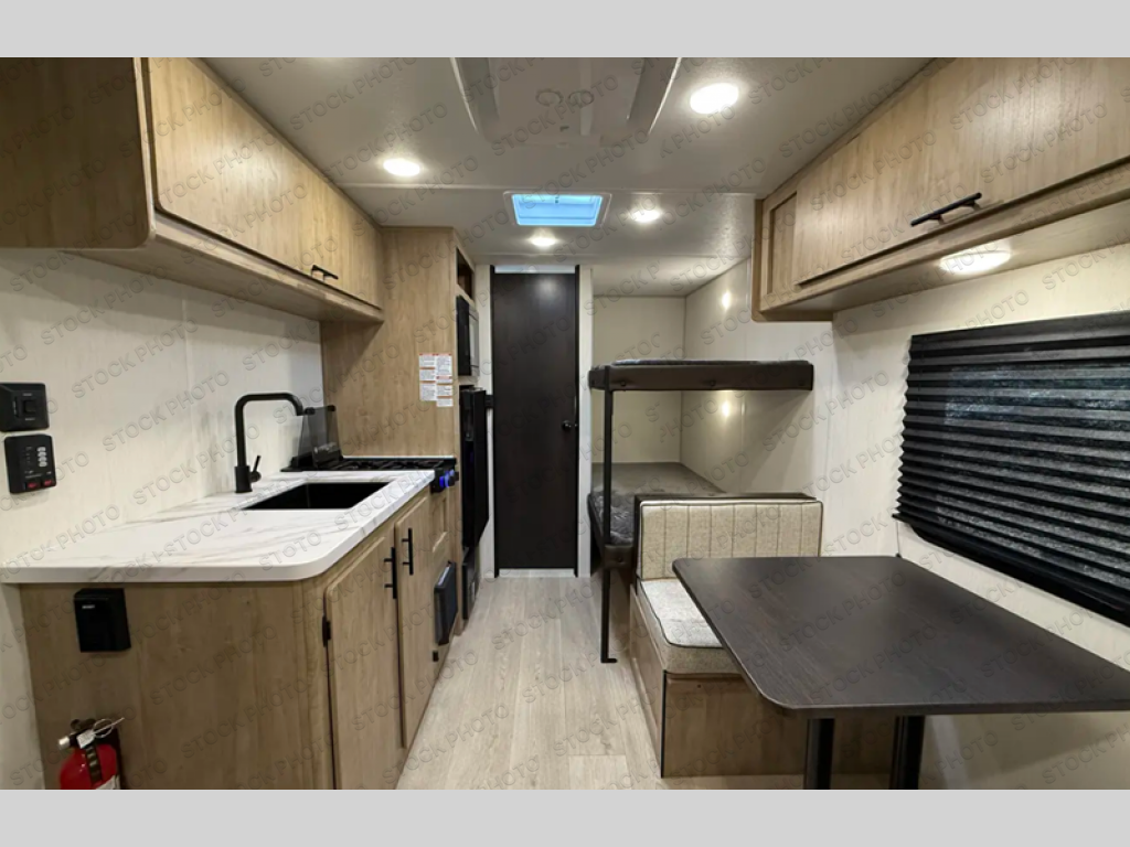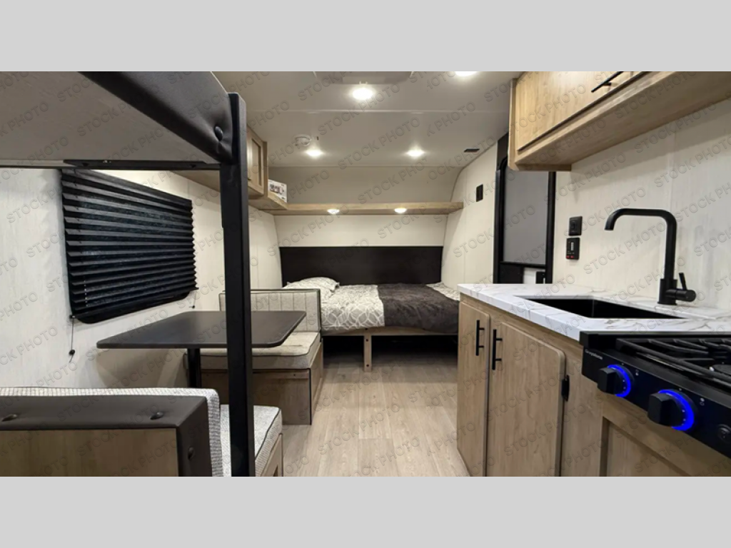 The whole family can sleep comfortably in this travel trailer! It has a set of bunk beds for the kids to sleep on, and you can sleep comfortably on the front queen bed with overhead cabinets and a shelf. The chef will enjoy preparing their best home cooked meals with the cooktop, and you can dine at the booth dinette. And the private bath onboard means you won't have to leave your camper in the middle of the night!