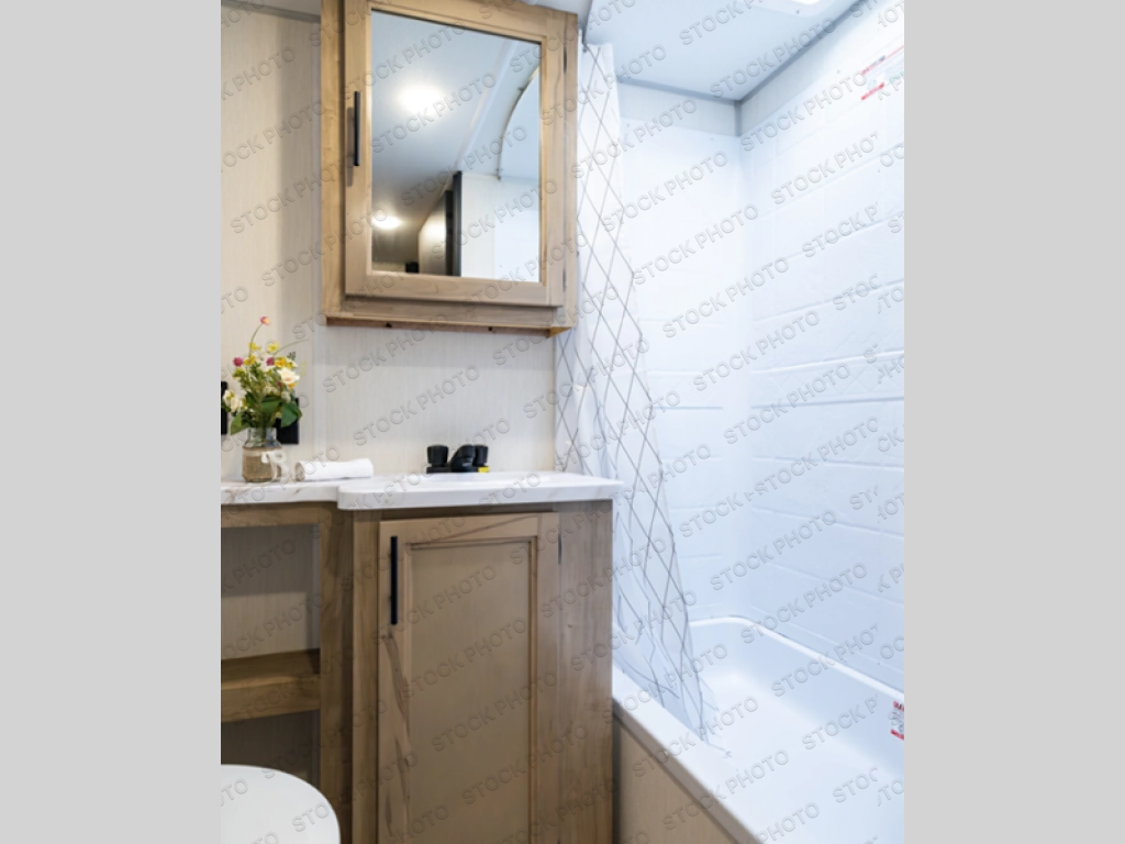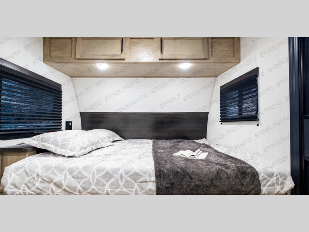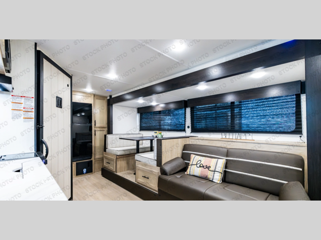Camping trips in this spacious travel trailer are sure to bring memories! Once you arrive at the campground, you can unload the outside storage, put out the 12' awning, and enjoy the outdoor mini kitchen. Once inside, you can dine at the booth dinette, relax on the sofa, and freshen up in the full bath with a tub/shower. The front queen bed will provide a great night's rest, while your guests sleep on the living area furniture. This travel trailer also includes ample interior storage, including a spacious kitchen pantry, an overhead cabinet above the bed, plus additional storage beside the refrigerator!
