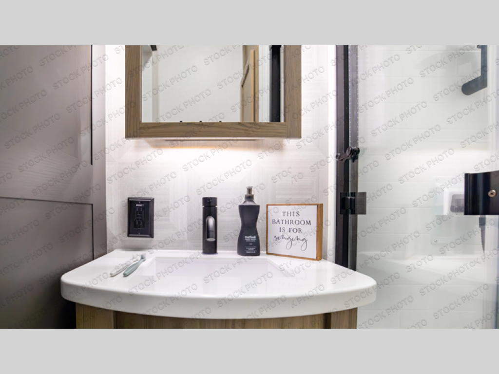 Designed for campers who want residential comfort with a layout that feels open, inviting, and easy to live in. The living area is set up for relaxing just as much as entertaining, making it a great fit for extended stays or weekends when you want to truly unwind. The theater seating gives you a comfortable spot to kick back, whether you’re watching a movie or winding down after a long day. The bedroom features a queen bed, creating a cozy retreat that still leaves room to move comfortably around the space. In the rear bedroom, a dedicated vanity adds a touch of everyday convenience, giving you a practical place. The full bathroom offers everything you need in one well-designed space, helping the coach feel more like home than a camper. Outside, generous pass-thru storage makes it easy to bring along larger gear, tools, or outdoor furniture while keeping the interior clean and uncluttered.