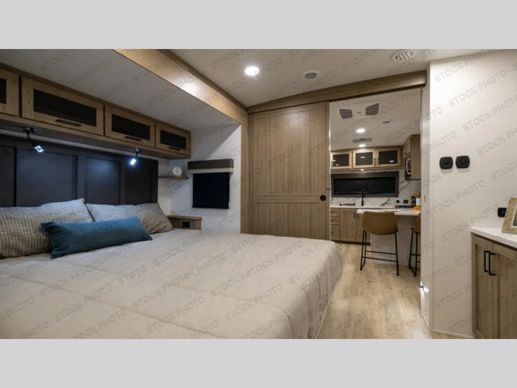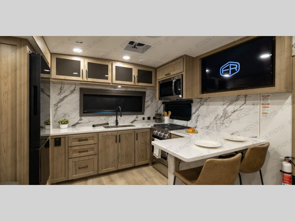 You will love how open this travel trailer will feel with the large front window that you can look out from the two-person bar top seating! The front kitchen has plenty of countertop space for you to prepare your best meals. Your nights will be spent in true relaxation with a 67" theater seating and king bed slide in the bedroom for a great night's rest. The full rear bathroom has a shower with a seat to take a nice, hot shower before bed, and a dual-sink vanity for two to get ready at once in the mornings!