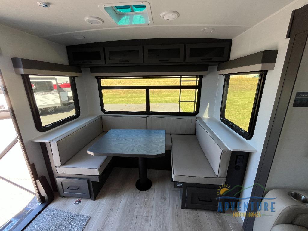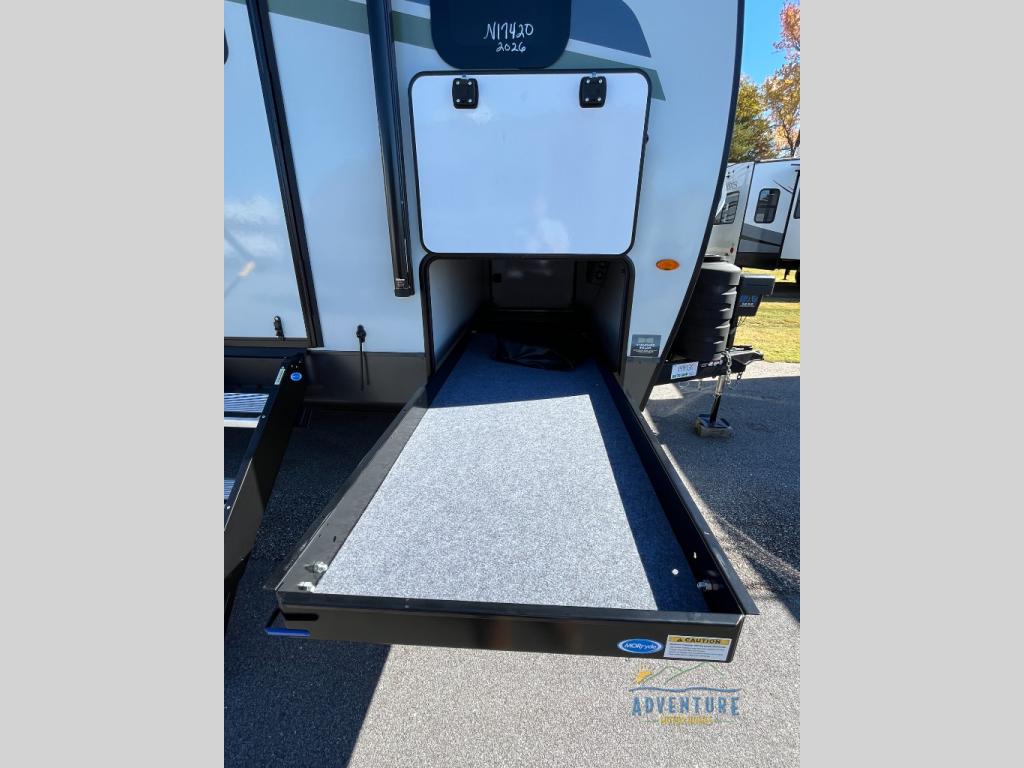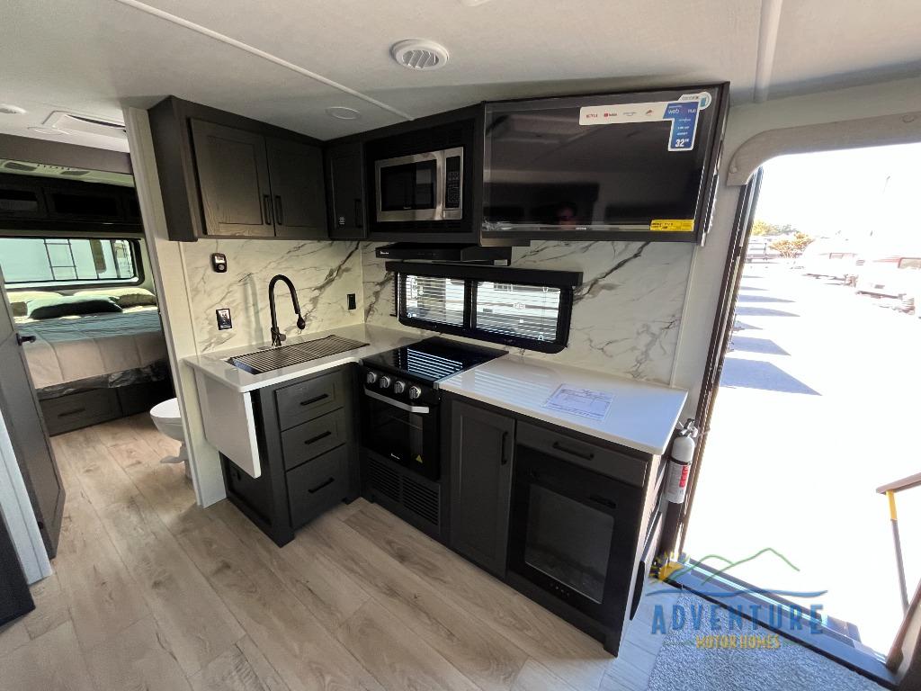 It will be so easy to enjoy time at the campground in this cozy travel trailer. The full kitchen includes a three burner gas oven, a microwave oven, and a 12V refrigerator to cook and store food, and the pantry will let you stock up on snacks. Your crew can get comfortable on the theater seat or around the rear U-shaped dinette, and there is a smart TV here to make it a movie night. The walk-thru bath will let you freshen up each day, and the queen bed in the front bedroom is sure to bring comfort. You will also find one of the dual entry doors here for convenience plus a wardrobe slide out for more storage and floor space. The exterior is just as accommodating with its pass-thru storage, 2" receiver hitch, and 21' power awning!