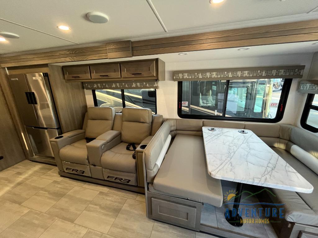 With each FR3 Class A gas motorhome by Forest River, you will find an easy-to-drive coach with a spacious interior allowing you to gather with friends and family with convenience and style found throughout! Each is built with vacuum-bonded construction, a one-piece fiberglass roof with extended rain spouts, a steel firewall and A-pillar extension, Bi-LED headlamps and lower LED fog lights, and grey Rotocast storage boxes with drains. Inside, you will enjoy black hardware, appliances, plumbing fixtures, and a glass shower door frame. You will also find a stainless steel kitchen sink with a bamboo cutting board and roll-up dryer, heavy-duty full-extension ball bearing drawer guides, dual-access dinette storage with doors, and nightstands with charging stations to keep your cellphones ready for whatever is next. Make your selection today!