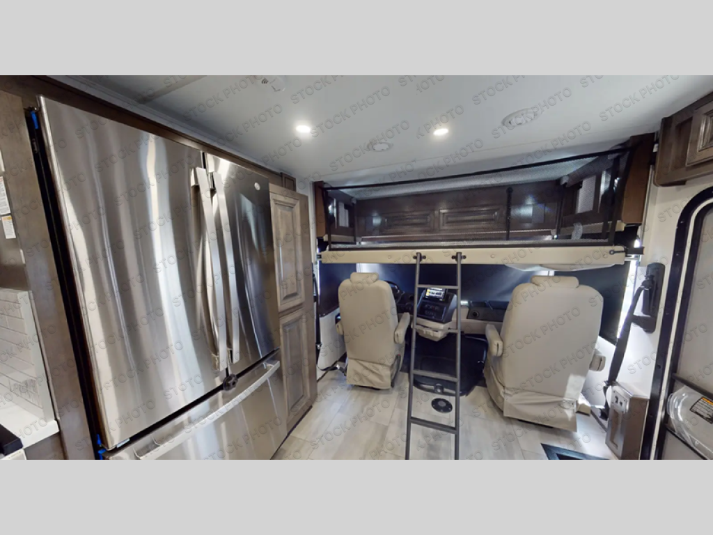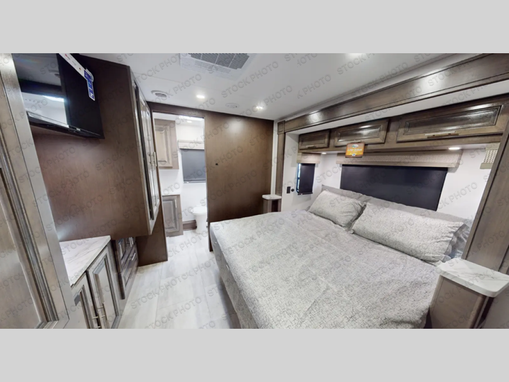 Three slides help to open up this motorhome! The kitchen slide features all of your essentials for cooking delicious meals and you even have a hutch with overhead cabinets to store all of your dishes. The Dream Dinette and Thomas Payne theater seating slide not only open up the living area but also provide comfortable places to eat meals and unwind in front of the 5,000 BTU fireplace and 40" LED TV after a long day of traveling. The half bathroom is close to the kitchen and living area, so you don't have to go far for a quick bathroom break. The master suite will have you feeling right at home with a 72" x 80" king bed slide to lay your head on at night with a dresser across from it that also has a 32" LED TV and wardrobes on either side of it with one of them with an optional washer and dryer. Plus, you even have access to the full rear bathroom which has a shower with a seat to freshen up in each morning!