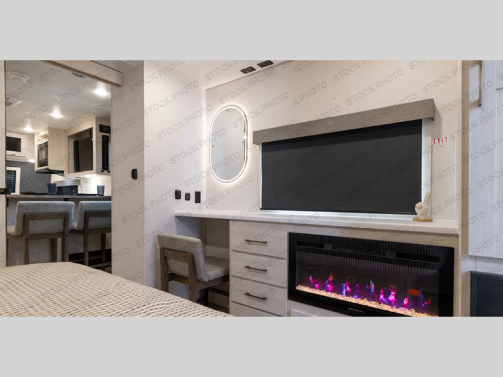 This couple's trailer will be giving you all the glamping vibes! There is a front kitchen with ample counter space, along with a counter with two bar stools, a central vacuum to easily clean up, and a slide out for more space! The second slide out is found in the middle master bedroom where you'll also enjoy a custom king bed across from a bedroom fireplace, a wardrobe, and a dresser with TV prep. Head towards the back and you'll be wowed by the full bath with dual bath sinks, an upgraded slow-close shower door, and a closet with washer and dryer prep. The exterior is just as impressive as the interior with its outside kitchen, 20' power awning with LED lights, slam-latch cargo doors, TV coax, and so much more!