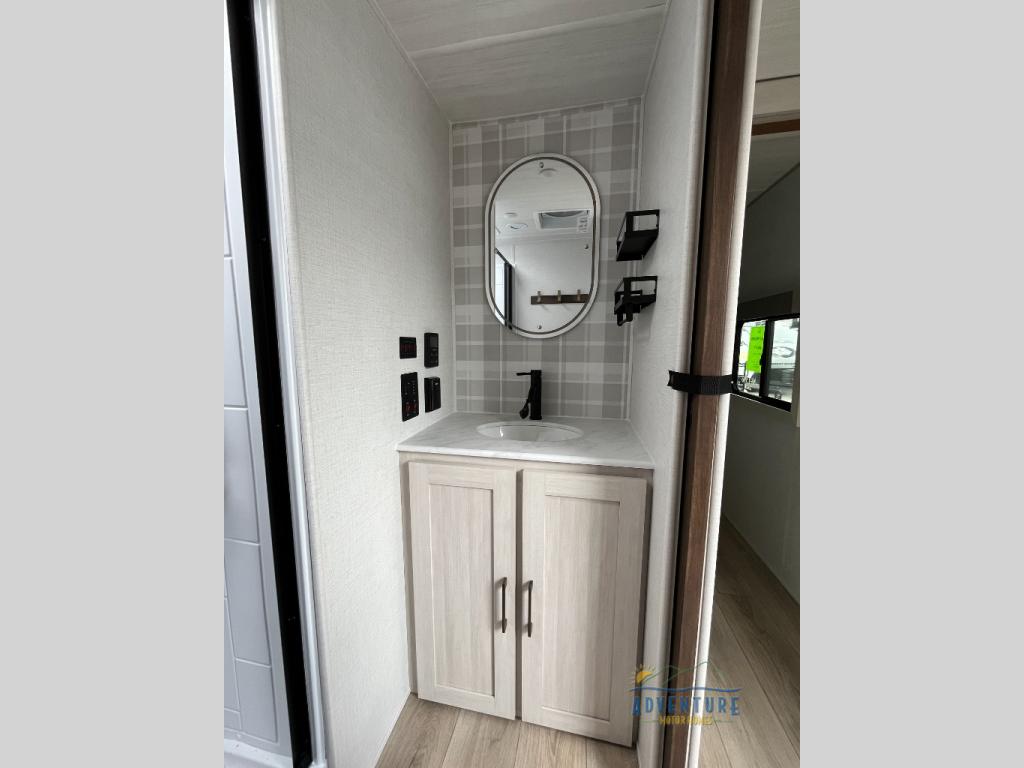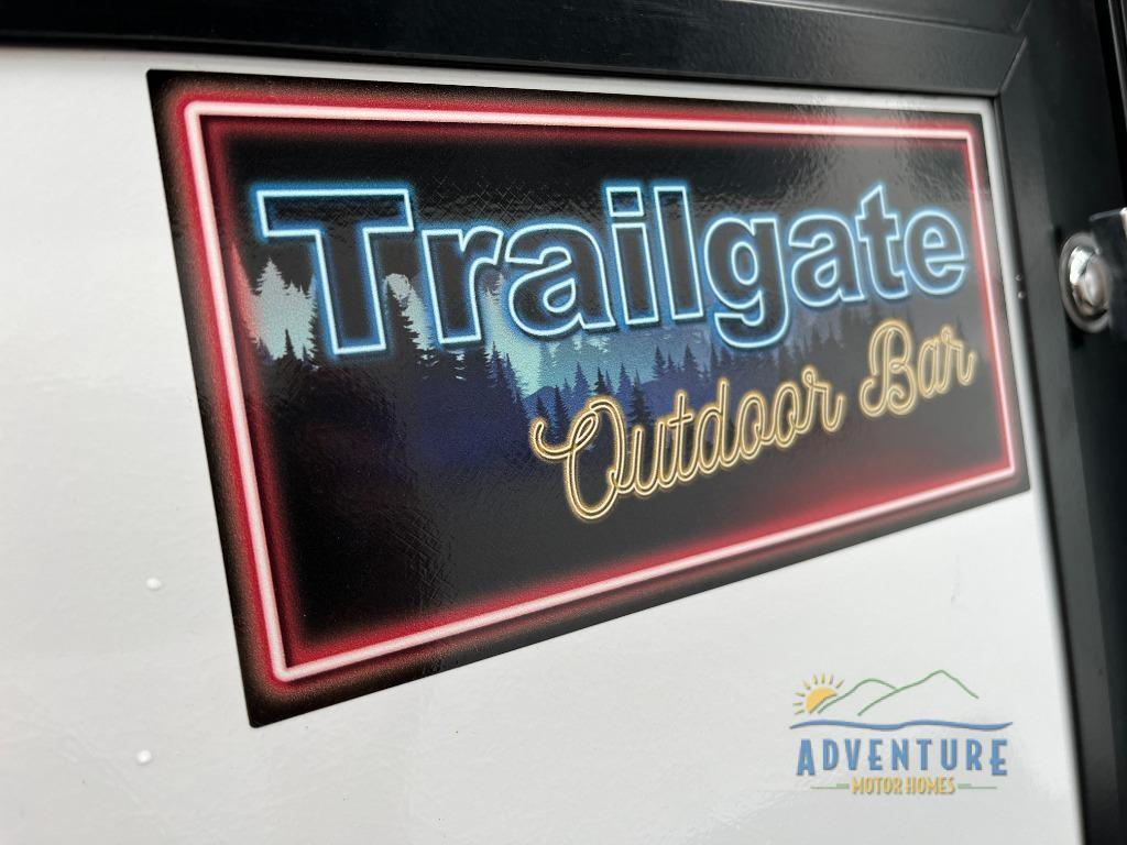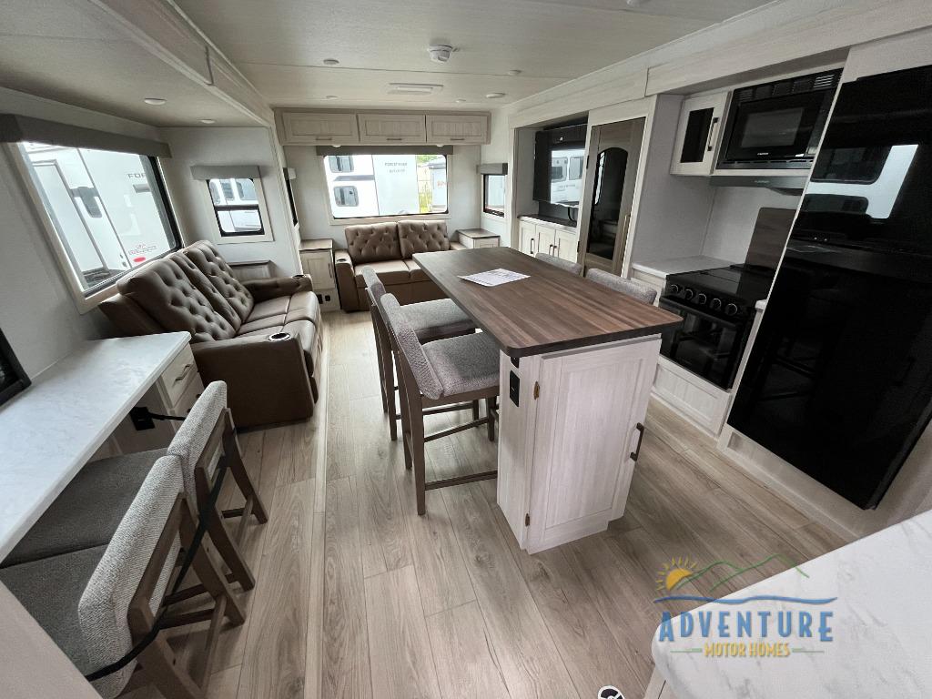 If comfort is what you're looking for, you won't have to search far with this travel trailer! There are dual opposing slides in the main living area for maximum space. The kitchen that flows from the living room area features a high-top dinette that gives a more residential feel to this space, plus there is a pantry, overhead storage, a 10 cu. ft. 12V black glass refrigerator, and more kitchen features you are sure to love. The rear living area includes an EZ-out sofa bed to provide sleeping space for two overnight guests, and there is a theater seat across from the fireplace and HD TV. You'll also enjoy a refreshing drink at the bar top that can also function as a desk! When it's time to call it a night, you can clean up in the spacious full bath, then head to the front bedroom. There is a custom king bed here along with two wardrobes and overhead storage that makes organizing easy!