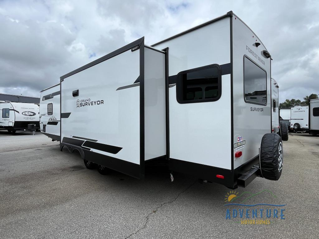 With any Grand Surveyor travel trailer by Forest River you will enjoy turn-key ready-to-go features and quality construction! Each model includes Azdel composite walls and a gel coated fiberglass front cap with an automotive style tinted windshield for a sleek look. There are friction hinge black glass entry door(s), an adjustable platform step with a night light, plus Goodyear tires and a power tongue jack for easy towing. The interior will have you feeling right at home with roller shades, residential faucets, sinks, and bathroom vanity, plus Surf(x) seamless countertops throughout. You can also plan for adventure with a 2" rear accessory and exterior spray port, and there are slam latch exterior baggage doors throughout to keep all your gear secure. Other stand-out features include a central vacuum system, a 200 watt solar panel with a 30 amp controller, a tankless water heater, carpet-free interiors, and the list goes on!