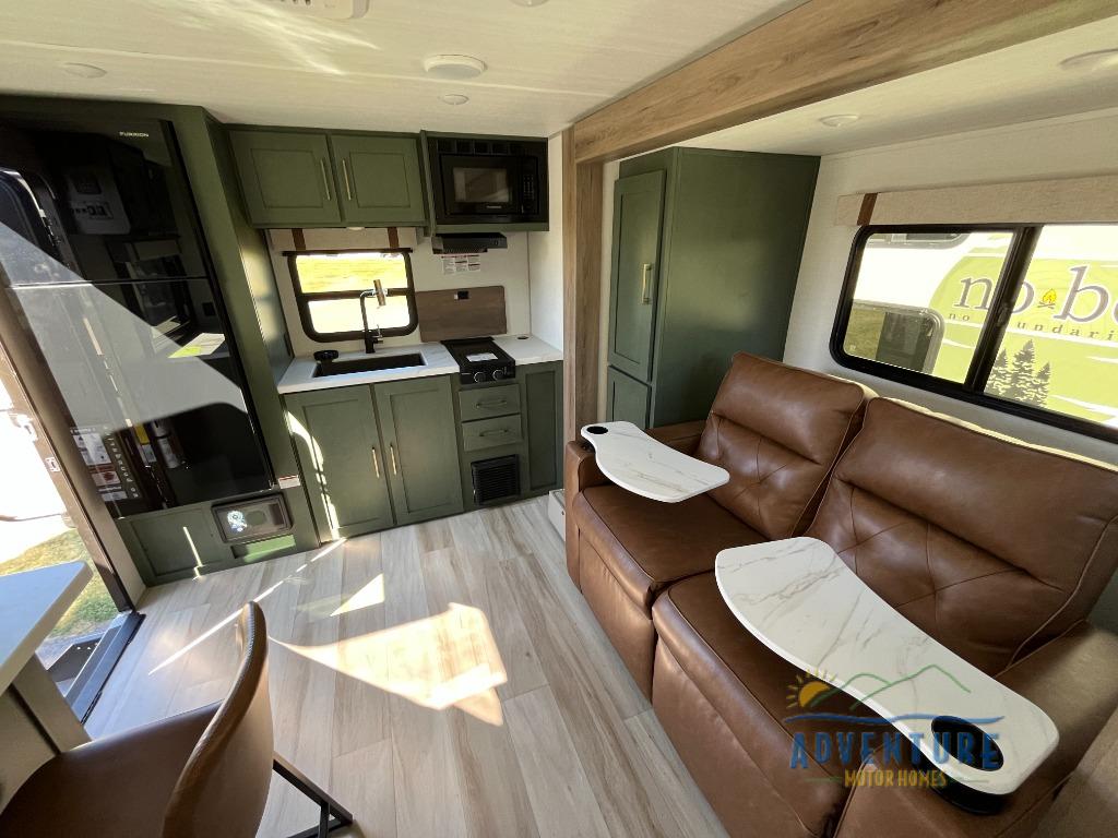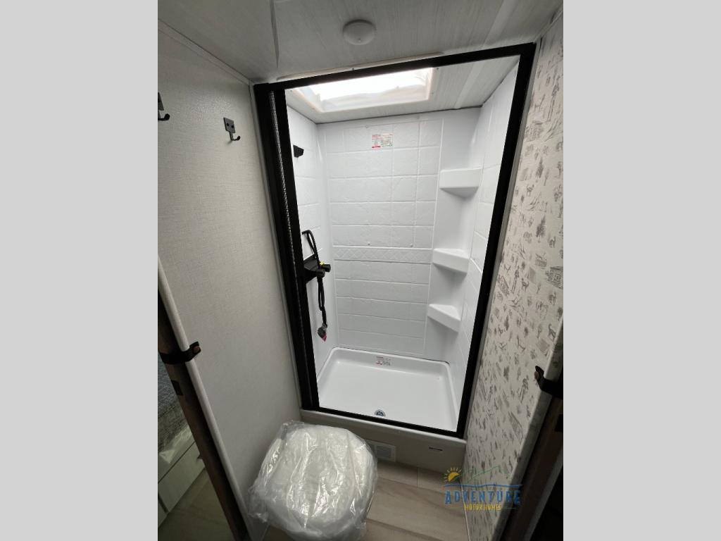 You'll love camping in this couple's trailer! There is a queen bed in the front bedroom, along with dual bedside wardrobes and overhead storage for clothes, books and more. And don't overlook the spacious walk-thru bath! Once you've made breakfast in the rear kitchen or on the outside kitchen, you can dine at the bar top with chairs and a flip-up window. There is also a Trailgate Outdoor Bar if you decide to dine outdoors!