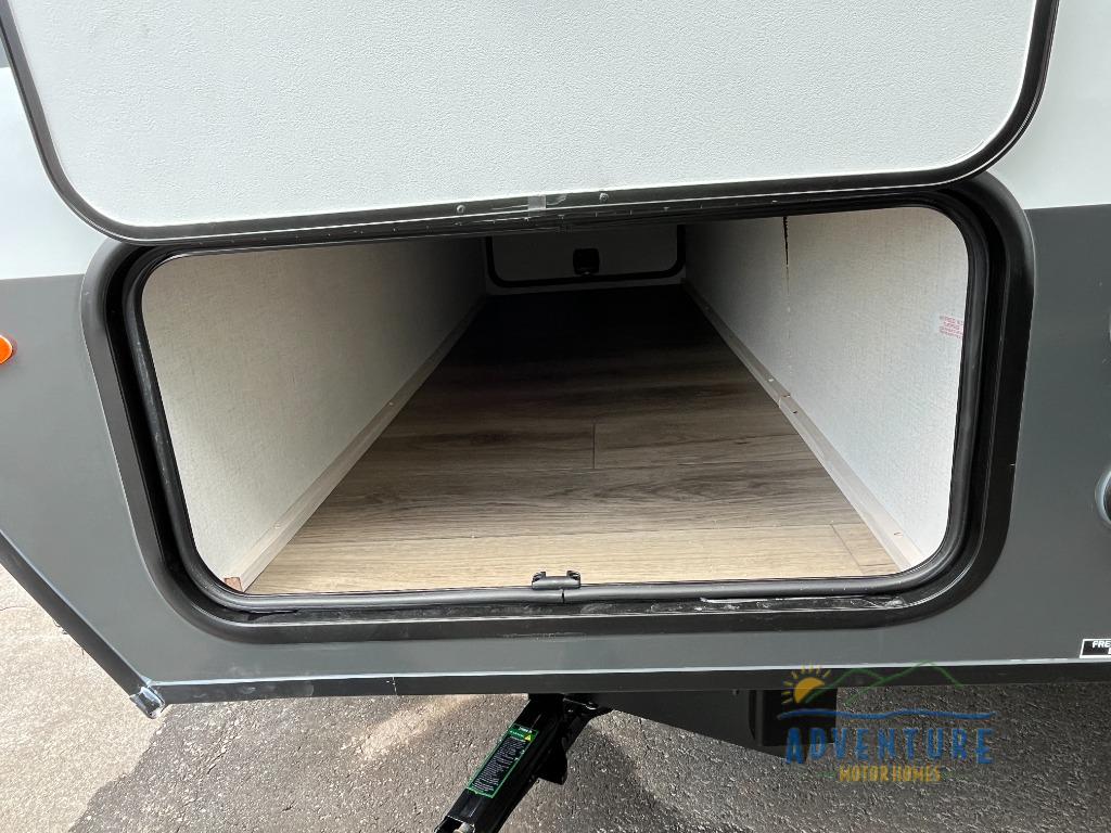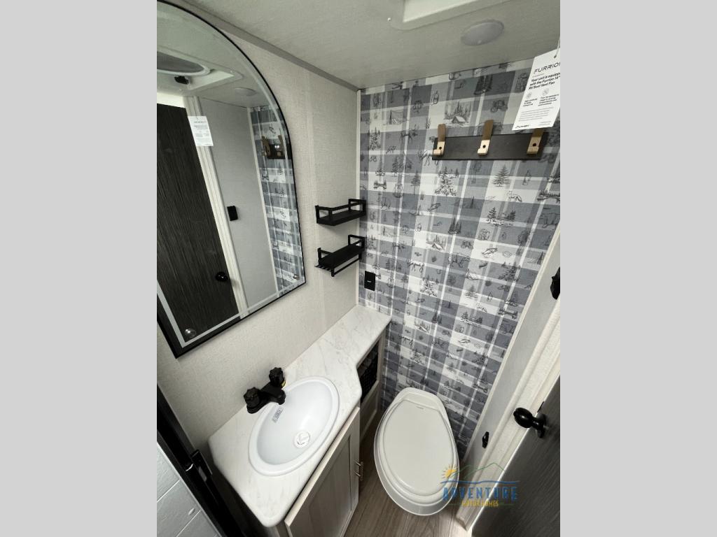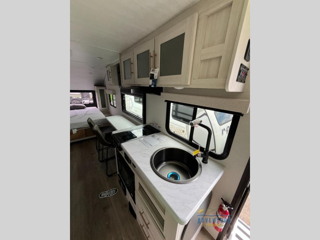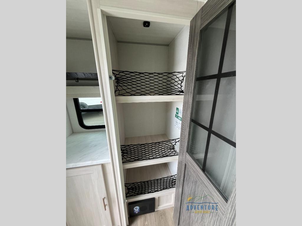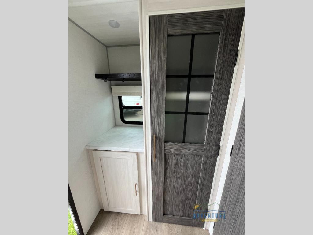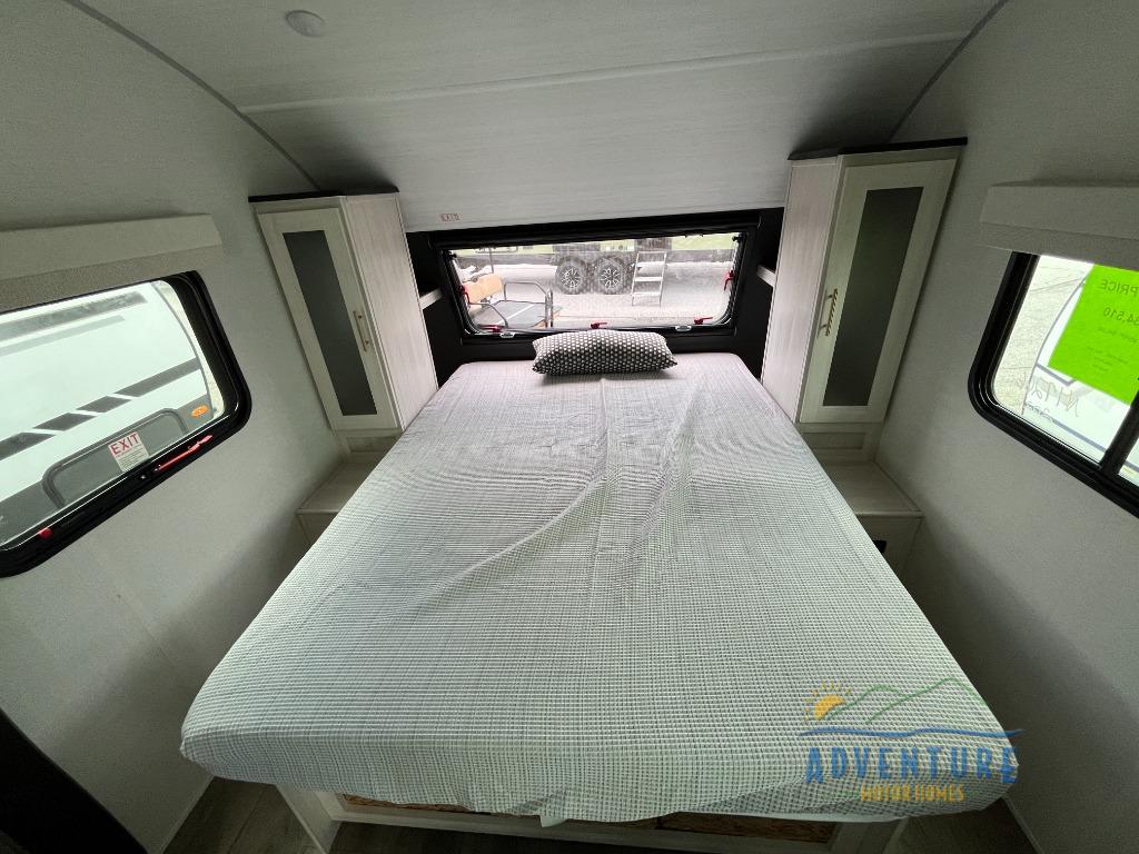 A front bedroom with a walk-around queen bed, a full bath, and a theater seat slide out are a few of the features that you are sure to want in your next RV! You can rest comfortably each night, plus all your clothing can be stored in the dual wardrobes to keep everything tidy. If you're needing more sleeping space, just choose the optional tri-fold sofa or optional booth dinette in place of the theater seat! The chef of your group can make meals on the two burner cooktop or in the convection microwave, and there is a 12V black glass refrigerator for perishables. And the bar top with two seats and the flip-up window provide a great view outdoors as you dine together.