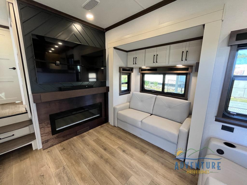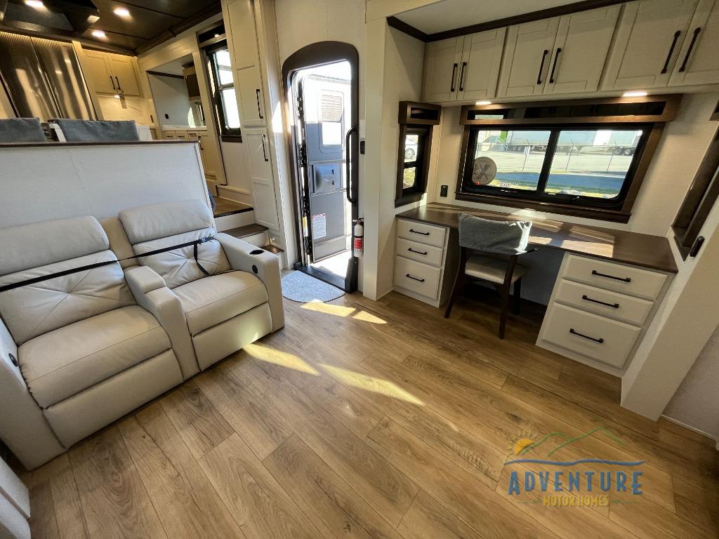 Load up and head out with this RiverStone toy hauler! You will have a great time enjoying the fresh outdoor air while you also enjoy the shade that comes from the 11' 6" and 18' electric awnings with LED lights. There is an exterior TV that you can watch if you don't have any other games you want to play, and you can access the below-floor garage by using the Zero Gravity ramp door in the back. If you don't need the desk to get some work done, you can switch it out for the optional E-Z glide sofa bed, and you already have a standard E-Z glide sofa bed sitting across from the desk. The fireplace keeps the living area cozy, and the dinette with two free-standing chairs in the kitchen overlooks the living area to give you another place to sit down and socialize.