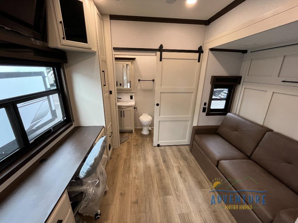 This is the perfect fifth wheel to travel with friends since there are two private bedrooms, one of which is a rear master with a full bath and its own exterior entry door. There is also a Murphy sofa here for your guests to sleep on, along with a wardrobe for their clothes and overhead storage. Head to the front private bedroom where you'll find a king bed slide, a dresser and a bench, a front wardrobe, plus a washer and dryer to make life at the campground easier than ever. The middle of this unit features the kitchen and living area. There is plenty of counter space plus a hutch and pantry for added storage. A sectional sofa provides tons of comfort, especially since its in perfect view of the fireplace and swinging entertainment center. There is also a dinette with four chairs where you can dine together and play a game of cards in the evening!