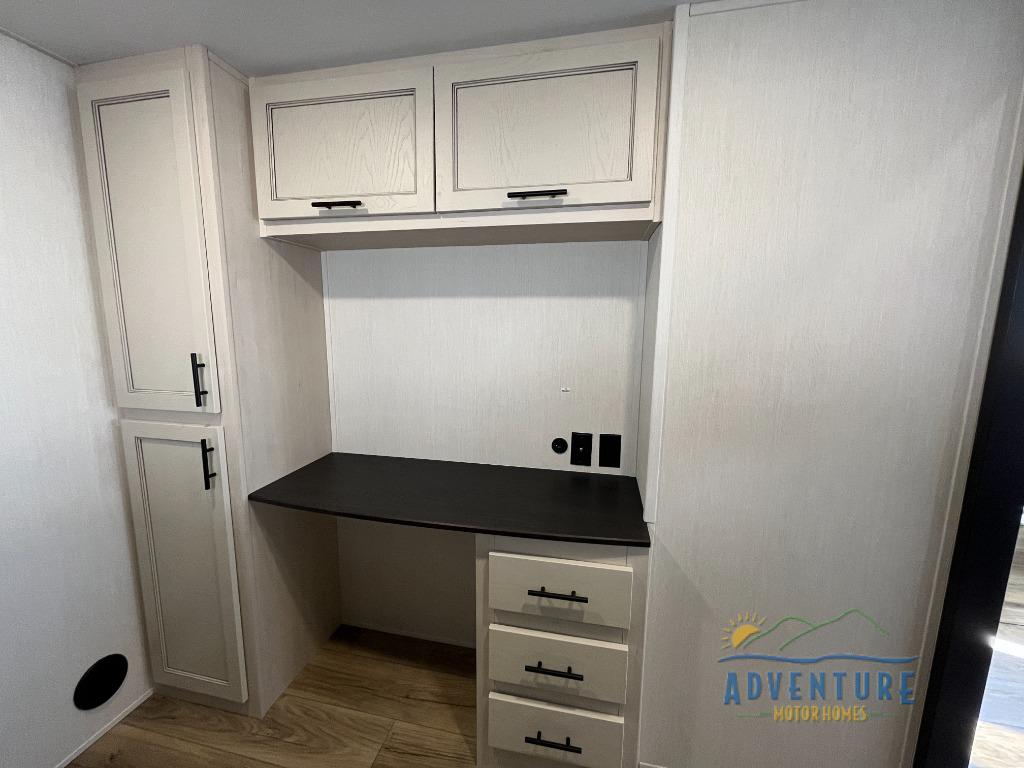 There is much to love in this fifth wheel! Starting with the second bedroom which has a slide that houses a flip-up bunk above a tri-fold sofa across from a desk with drawers, a drop zone, and a wardrobe, plus above all of that is a storage/bunk loft. The rear living area includes a tri-fold sofa, a TV with a hidden pantry behind, and theater seating for two making this space another area at night for guests. In the morning, you can prepare breakfast on the kitchen island, then dine together at the versatile dinette/desk. The full bath will allow you to stay clean throughout your trip, and you'll feel right at home in the front private bedroom with a camper king bed, a dresser, and front wardrobe. Outside, a kitchen and two power awnings create an inviting space!