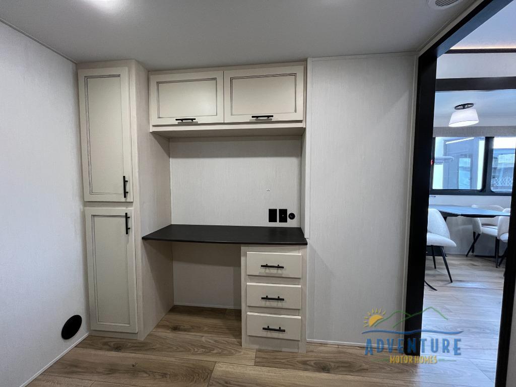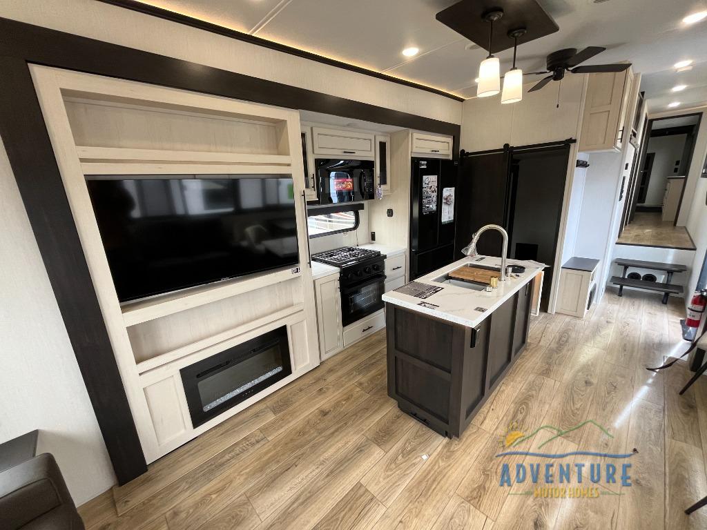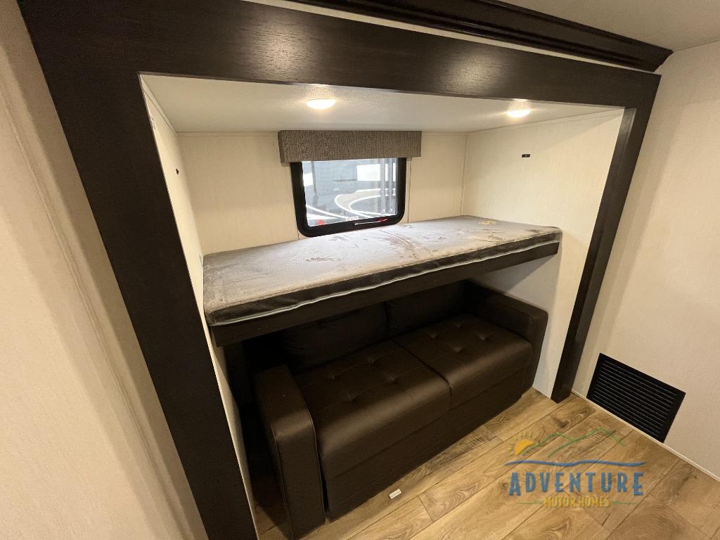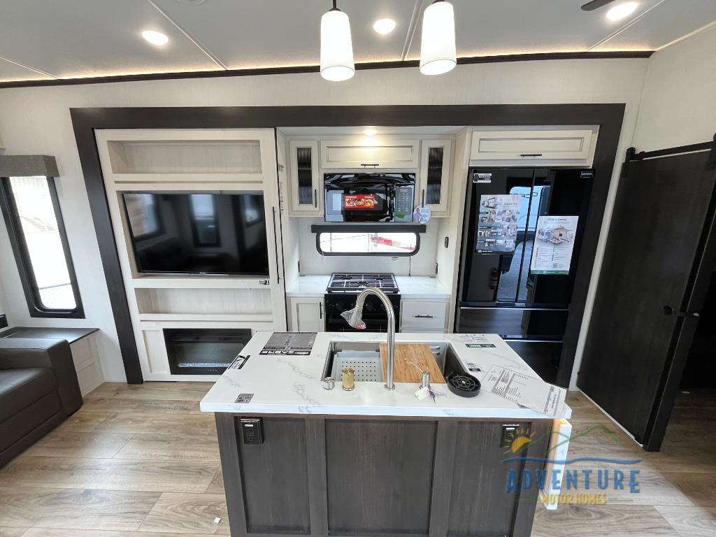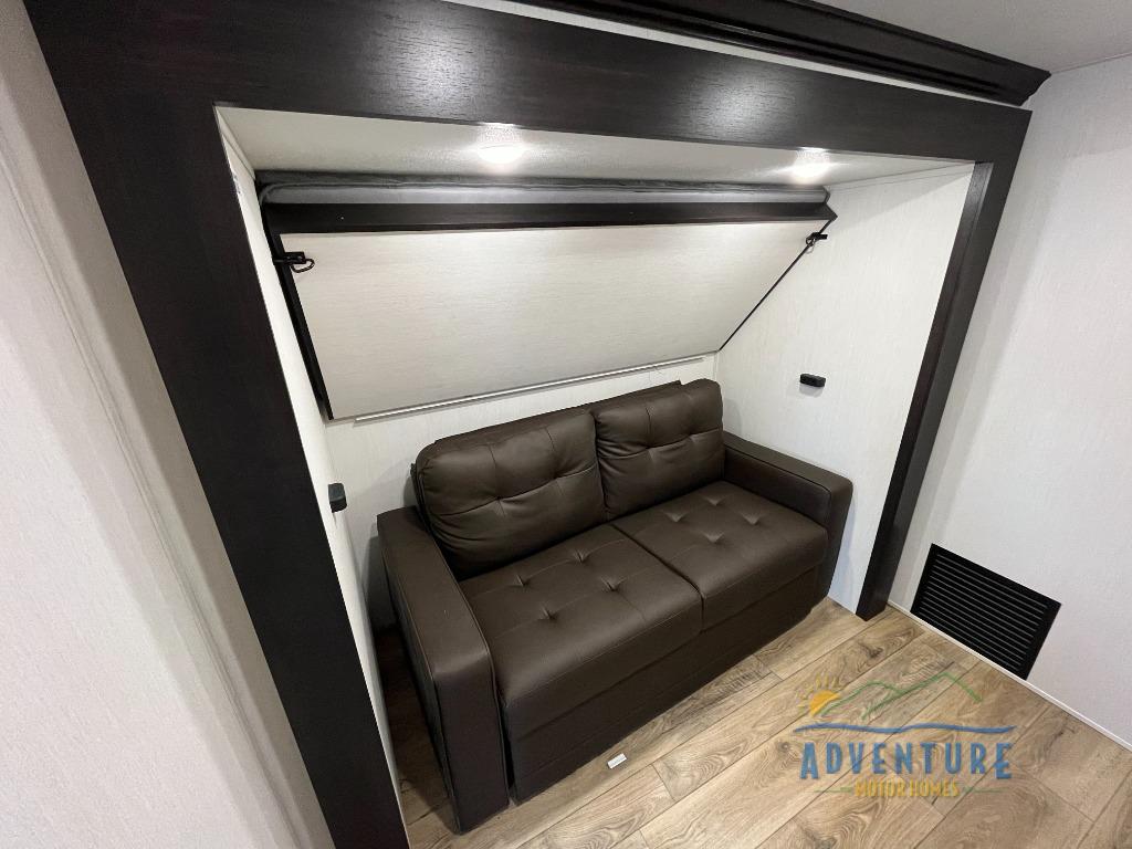 There is much to love in this fifth wheel! Starting with the second bedroom which has a slide that houses a flip-up bunk above a tri-fold sofa across from a desk with drawers, a drop zone, and a wardrobe, plus above all of that is a storage/bunk loft. The rear living area includes a tri-fold sofa, a TV with a hidden pantry behind, and theater seating for two making this space another area at night for guests. In the morning, you can prepare breakfast on the kitchen island, then dine together at the versatile dinette/desk. The full bath will allow you to stay clean throughout your trip, and you'll feel right at home in the front private bedroom with a camper king bed, a dresser, and front wardrobe. Outside, a kitchen and two power awnings create an inviting space!