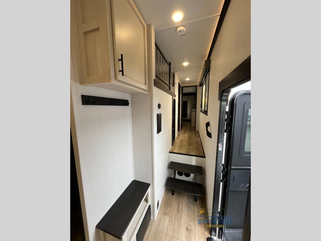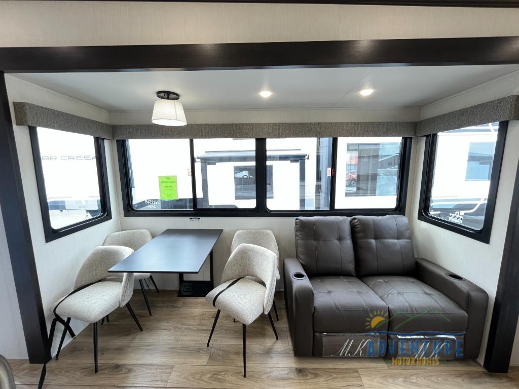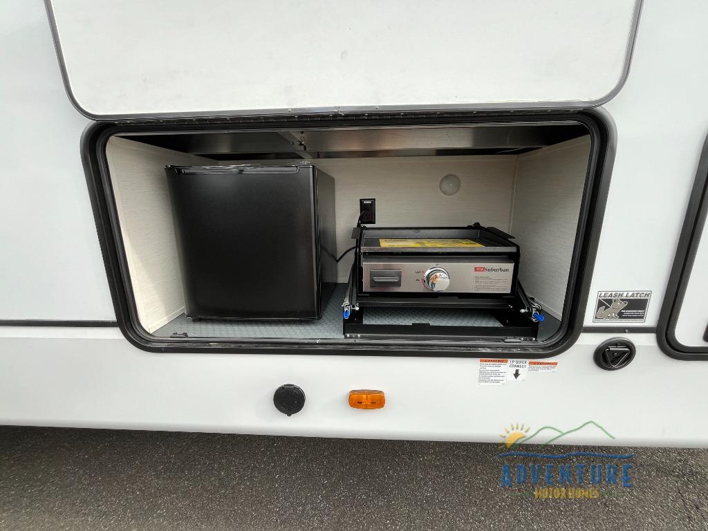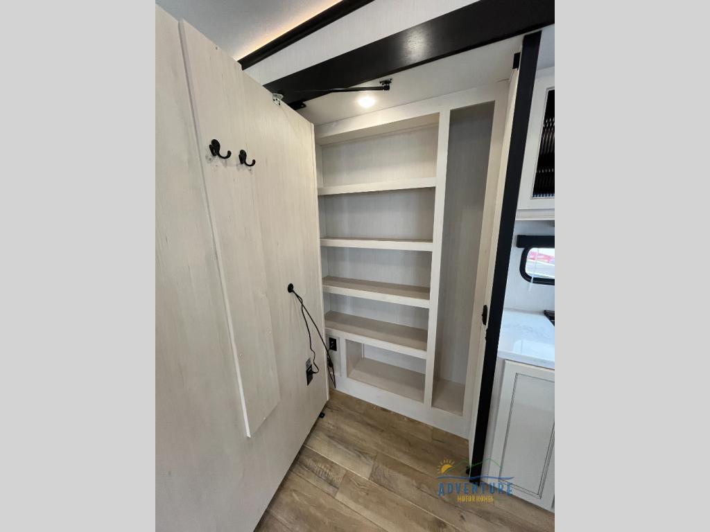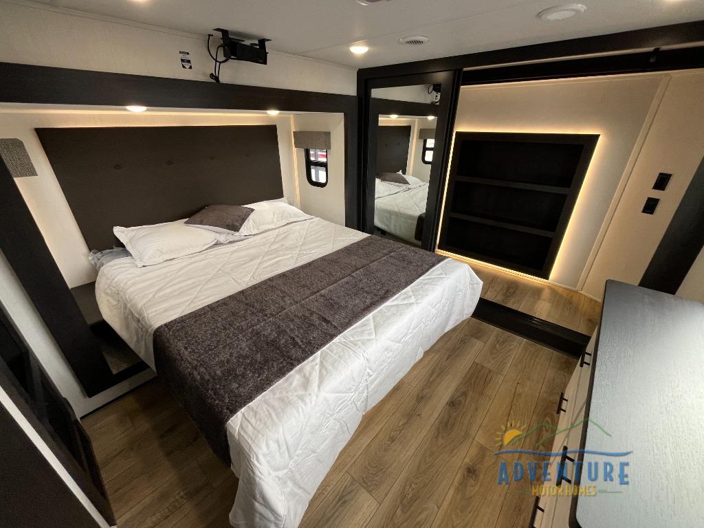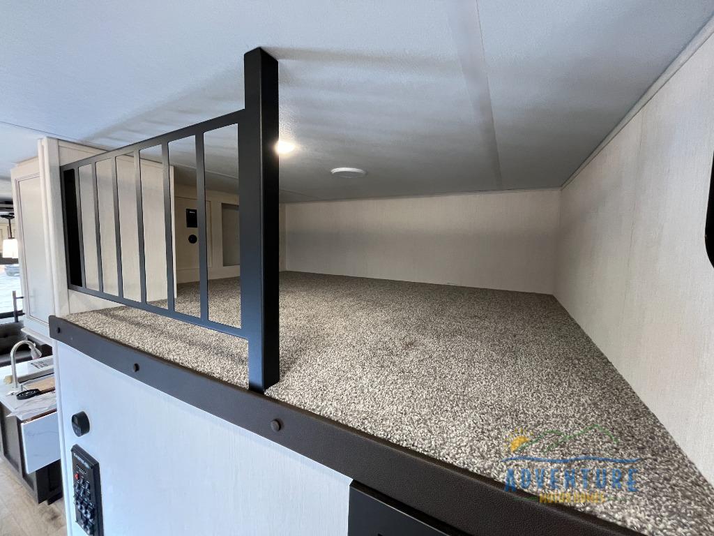 There is much to love in this fifth wheel! Starting with the second bedroom which has a slide that houses a flip-up bunk above a tri-fold sofa across from a desk with drawers, a drop zone, and a wardrobe, plus above all of that is a storage/bunk loft. The rear living area includes a tri-fold sofa, a TV with a hidden pantry behind, and theater seating for two making this space another area at night for guests. In the morning, you can prepare breakfast on the kitchen island, then dine together at the versatile dinette/desk. The full bath will allow you to stay clean throughout your trip, and you'll feel right at home in the front private bedroom with a camper king bed, a dresser, and front wardrobe. Outside, a kitchen and two power awnings create an inviting space!