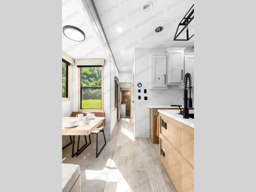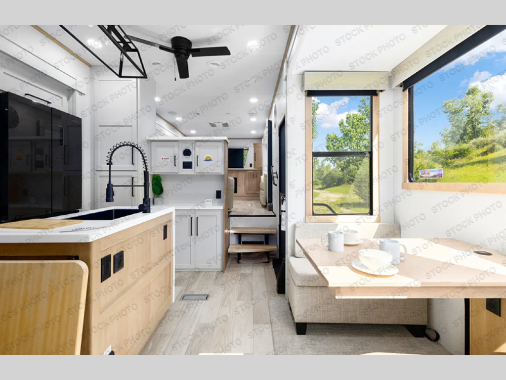 The perfect fifth wheel for a larger family! This unit sleeps eight people the loft above the rear master bedroom and bathroom. In the loft area, there are two 44" x 74" bunk mats for comfort as well as wardrobe/storage at the head of each. The master bedroom features a king size bed that slides out to create more space by the bed. A spacious bath features a one-piece fiberglass shower for comfort. A spacious kitchen features two slides, a free-standing dinette in one, and the 12V refrigerator and stove in the other. There is also a center island with large sink for added food prep space. Head up the steps in front to a dual slide front living area with 50" TV and fireplace beneath the window. There is also theater seating opposite the TV, and a tri-fold hide-a-bed in each slide allowing added sleeping space when needed.