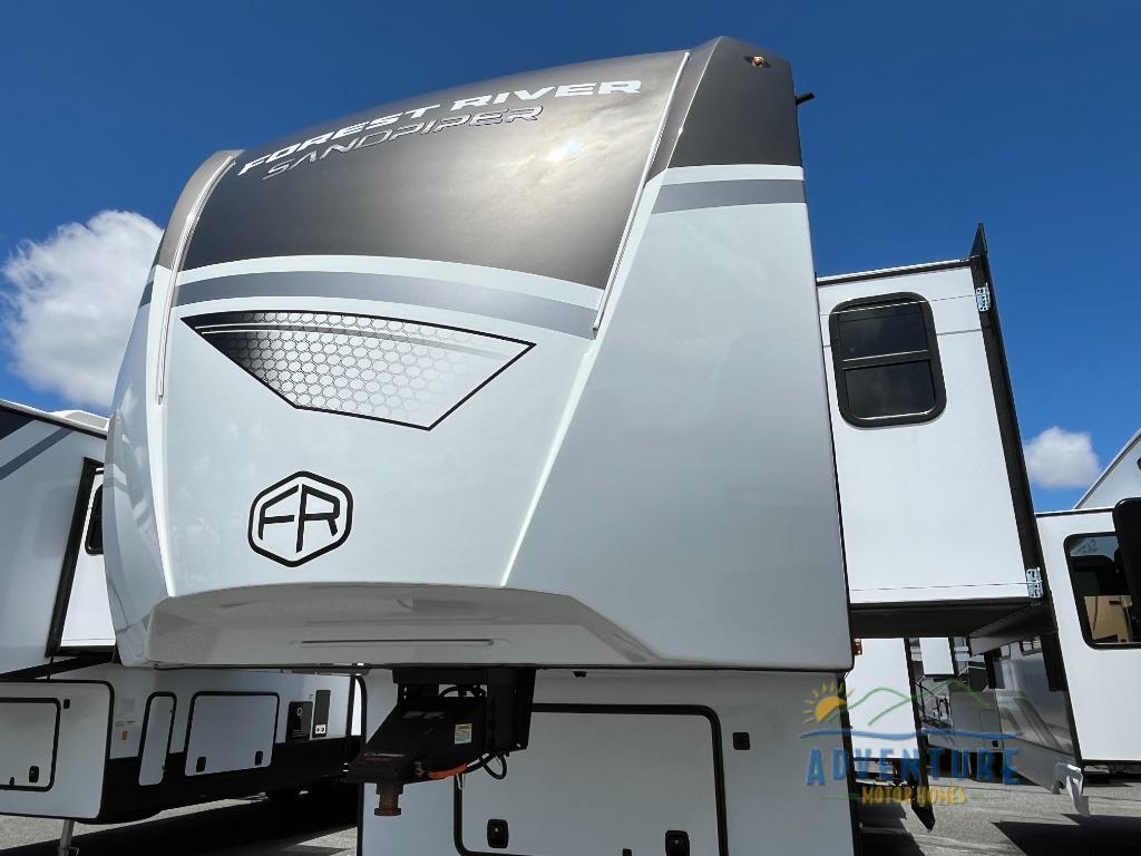 You will find the perfect balance of size, space, features, and luxury with any one of these Forest River Sandpiper fifth wheels! They are constructed with a welded aluminum framed vacuum bonded laminated superstructure, a cambered powder coated frame with rust prohibitor, and a fully enclosed underbelly for added protection against the elements. The large tinted windows come with a 80/20 UV prohibitor or you can choose the optional dual pane windows. Some hassle-free amenities include a 60k BTU on-demand water heater, full coach water filter system, tire pressure monitor system, and an electric leveling system! Inside, you'll enjoy stainless steel appliances, solid surface countertops, Beachside Sundance linoleum, recessed residential lighting, and many more comforts!