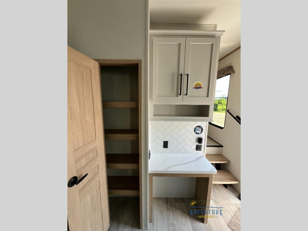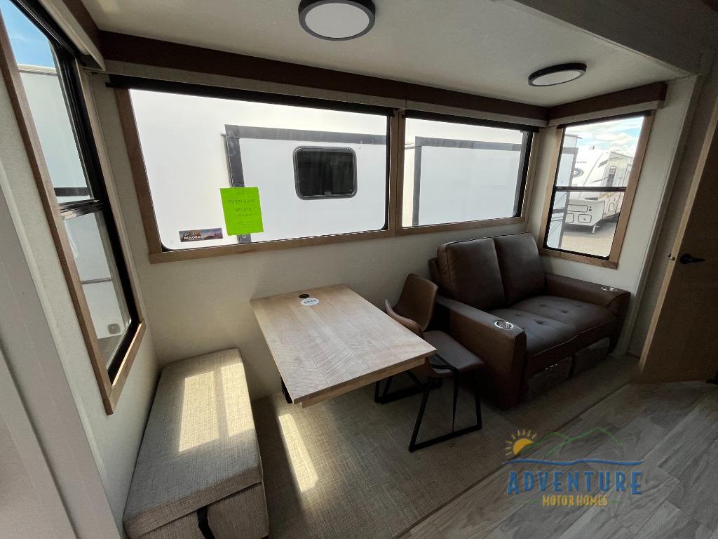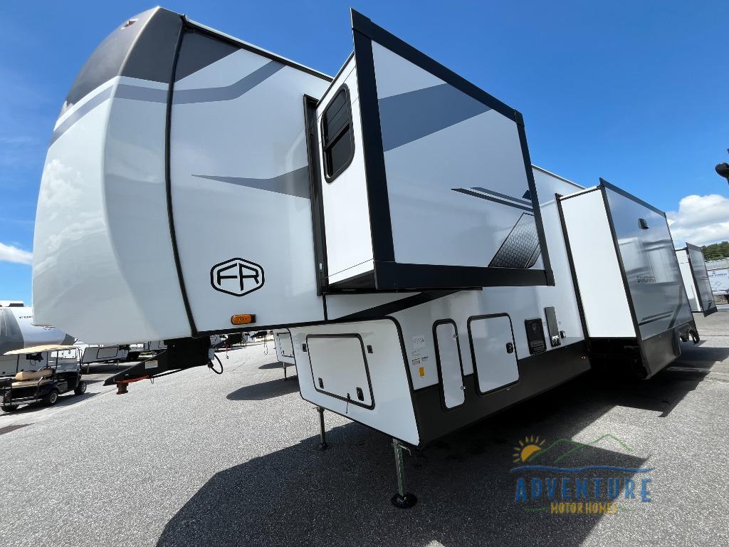 Weekend camping trips and full-time RV living is made complete in this quad slide out fifth wheel. Your crew can relax under the two power awnings, or head inside to enjoy the fireplace. There is also a 50" flat screen TV across from the theater seating, plus a free-standing dinette to dine at. There are two full baths with the front bath including a walk-in shower with a seat for your comfort, and the front private bedroom will feel just like home with its queen bed and large front wardrobe. There is even washer and dryer prep to make laundry day easier than ever. The master bedroom in back includes a second queen bed slide out, and the rear full bath has another convenience with it's exterior entry door, and