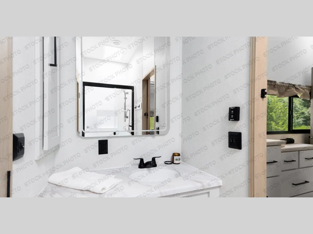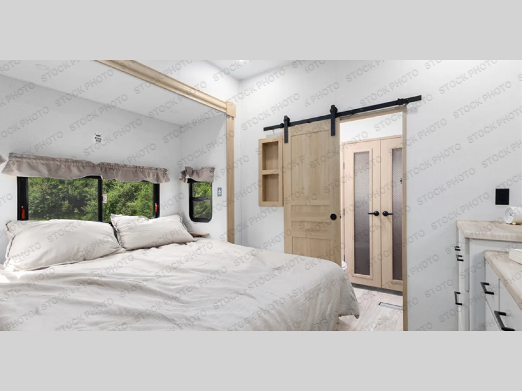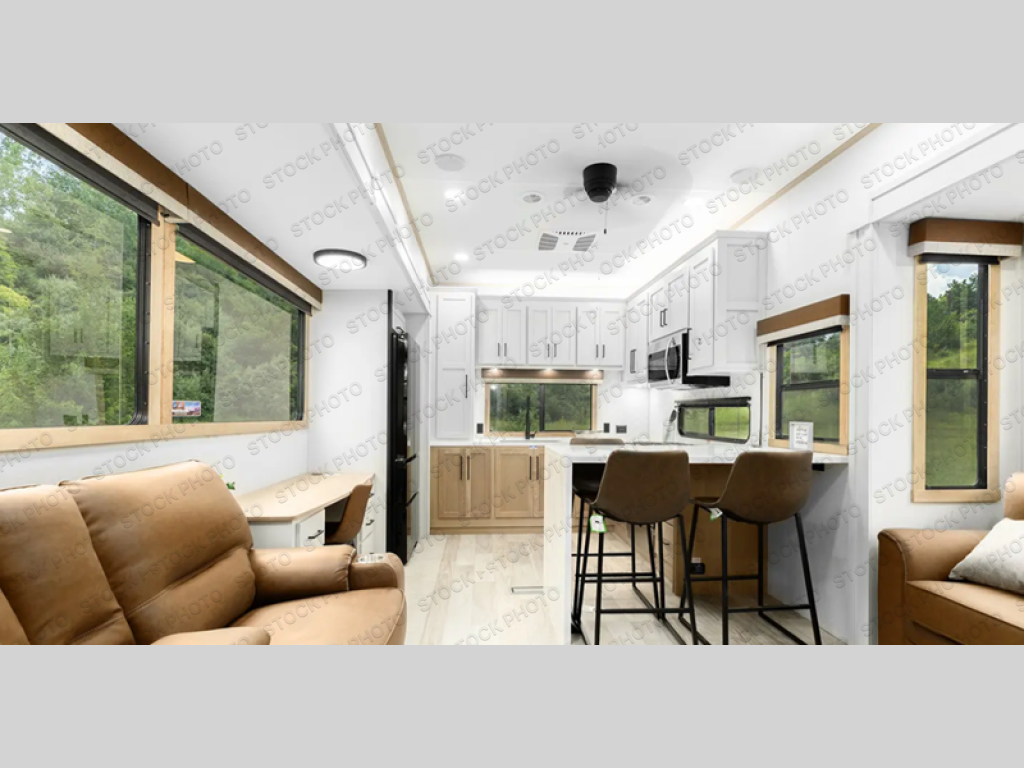 One look at this destination trailer and you'll be sold! You'll love waking up each morning in the master bedroom with a king bed slide out, dual nightstands, and a dresser to keep clothes organized. There is also a spacious front bathroom with a walk-in closet! As you walk to the main living area, you'll find the half bath with washer and dryer prep if you plan to add these appliances. A tri-fold hide-a-bed sofa and theater seating in the living area will let you relax each day, and the bar with stools overlooks the kitchen so you can visit with the chef while dinner is being made.