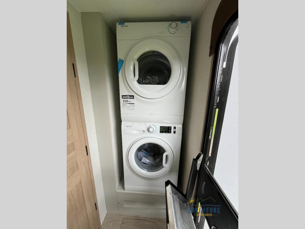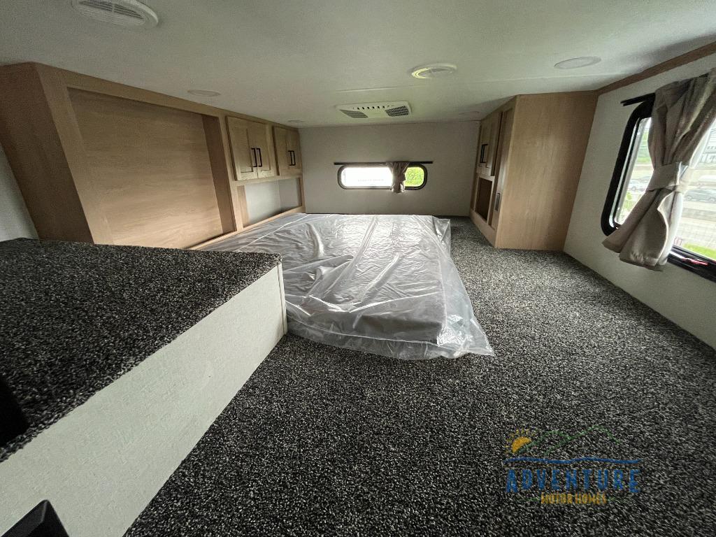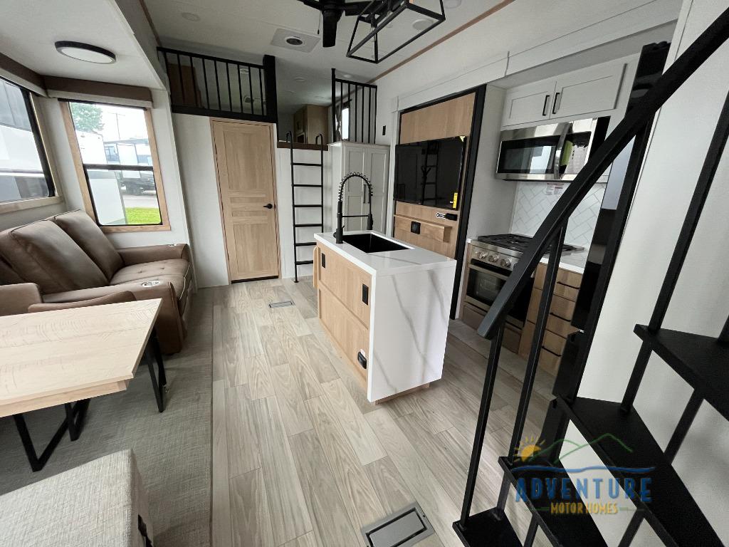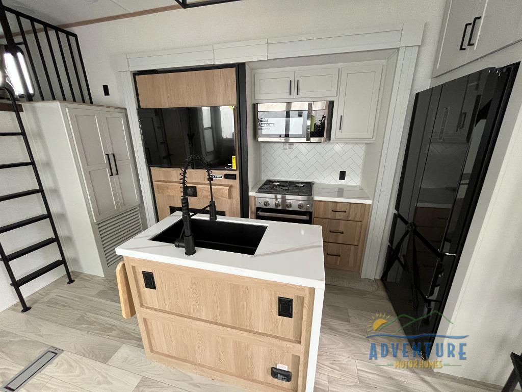 You won't believe the comfort and convenience found in this destination trailer. There are two private bedrooms; one up front with a queen bed slide out and storage space, and one in back with a queen bed slide out and a half bath! There is even washer and dryer prep here if you want to add those appliances and the second entry door is also found in this location so you can easily slip out in the morning. Above each of these rooms is a loft providing three total bunk mats for sleeping, storage cabinets, and TV prep if you want to add entertainment. Everyone can meet in the combined kitchen and living room that includes dual opposing slides, a 60" theater seating across from a 50" flat screen TV and fireplace, plus a free-standing table with chairs and a bench to dine at. The chef of your group will love the large kitchen island, Chef Collection three burner range, and a 16.2 cu. ft. refrigerator for food storage.