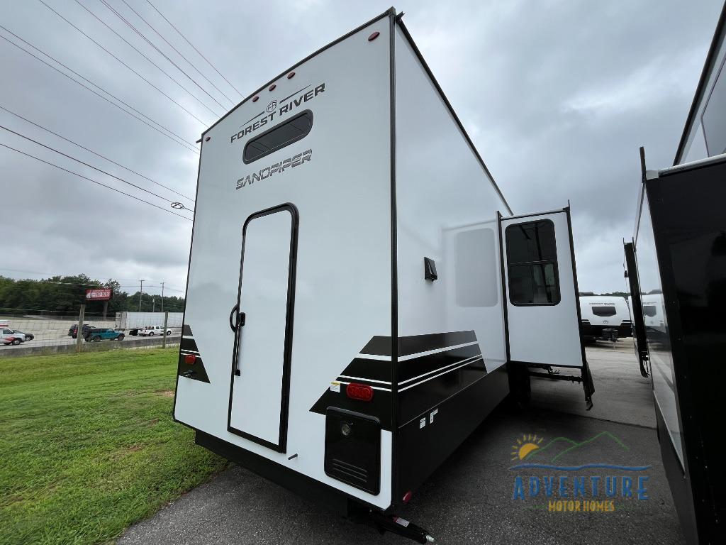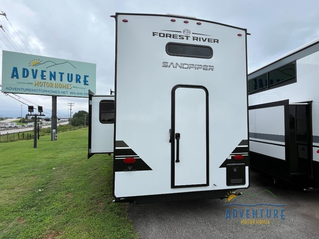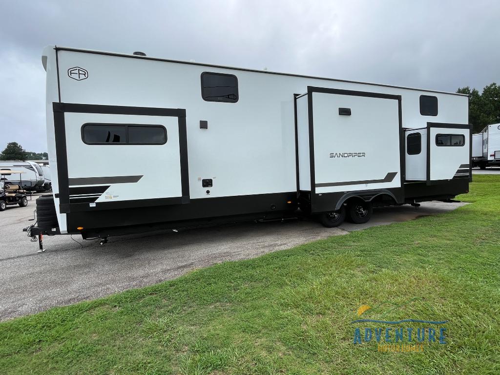 With each Sandpiper Destination Trailer by Forest River you will enjoy many luxurious features, such as crown molding over the kitchen cabinets, solid surface kitchen countertops, a memory foam mattress, plus so much more. The extra large picture windows throughout let natural light in and provide beautiful outdoor views, and each model includes three or more slides for added interior space. You'll find many exterior conveniences, like the porch light with an interior switch, the rain gutters with extra long drip spouts to prevent black streaking, and an electric awning with LED light strip, plus more! You will stay comfortable year around with dual 15,000 A/C units plus each model is constructed with an Underbelly Armor for better protection and insulation!