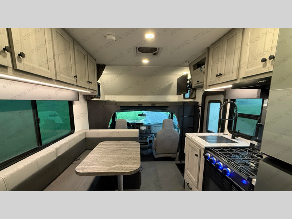 Travel in style with your own accommodations in this coach. You'll find a queen-size cab-over bunk that can be utilized as extra sleeping space or even storage, plus the rear corner offers a queen bed. And don't forget about the U-dinette as extra sleeping space after dining, playing games and relaxing. The kitchen offers a 10-cu. ft. 12V refrigerator, a convection/microwave/air fryer, and a flip-up countertop for more prep space. The private toilet and shower gives you a place to get cleaned up, and the bathroom sink is just outside the door allowing someone else the ability to get ready at the same time.