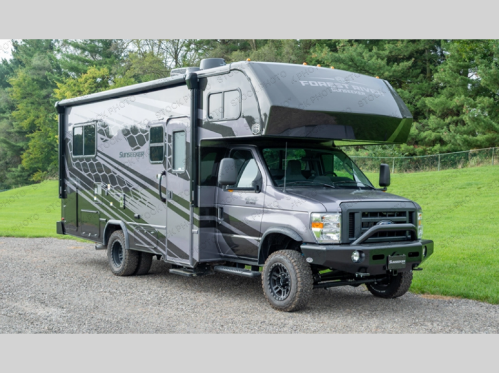 The Forest River Sunseeker Class C gas motorhome with the 4x4 Off-Road Extreme Package is ready for adventure when you are! It sits on a durable Ford E450 chassis with 4-wheel drive and 4" lift kit so you can tackle tougher terrain and back roads. There are also upgraded off-road wheels and tires, upgraded Bilstein BG 4600 off-road shocks, and an upgraded front bumper with brush guard and off-road lights. You will love the sleek full-body paint, along with carbon fiber accents, back up camera system, and the heavy-duty industrial flooring that will withstand your adventurous lifestyle. Additional features include power mirrors, a 7,500 lb. towing hitch, an LP Quick Connect, and a 200-watt solar 12V charging system for off-grid capabilities!