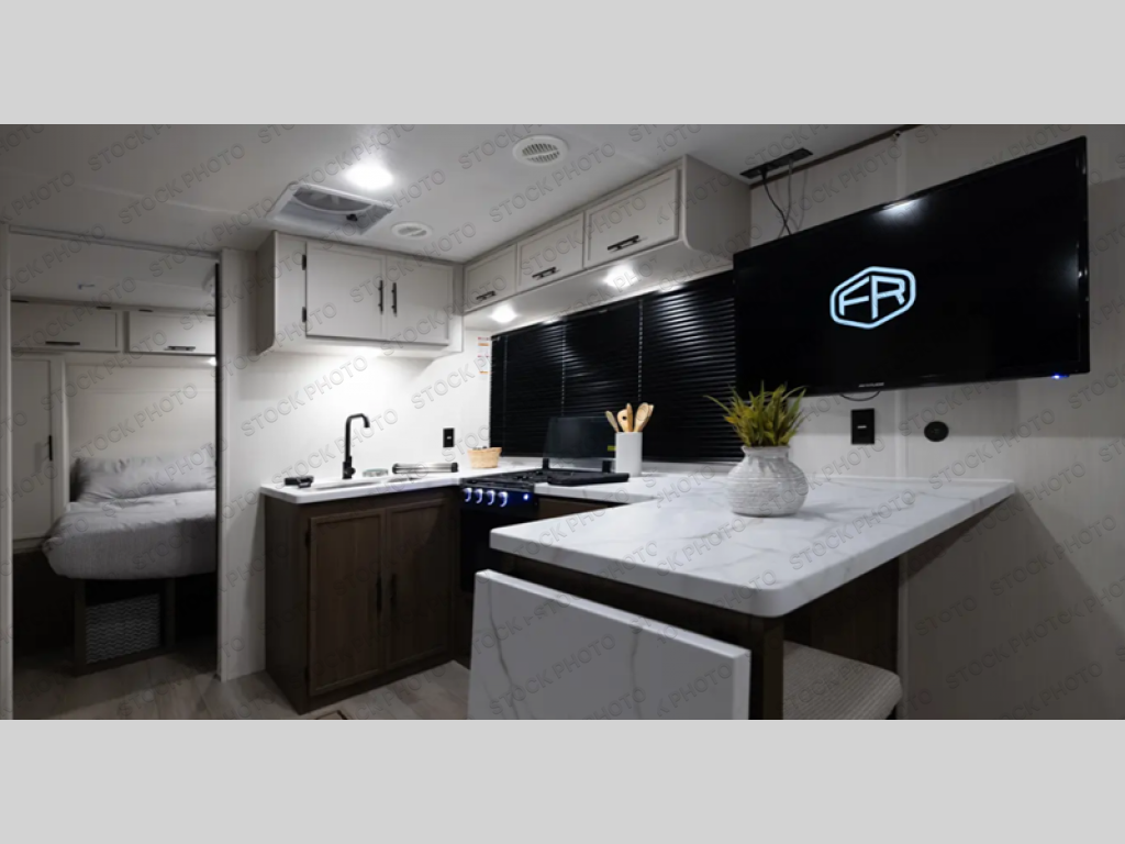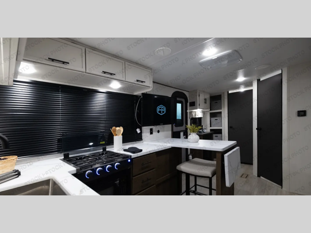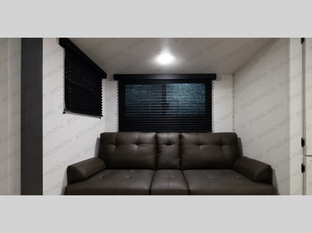 Head to your local state park in this spacious travel trailer! Once you arrive at the campground, you can grab a cold drink from the exterior refrigerator, then head inside to make lunch. An L-shaped counter with two stools provides a place to enjoy your morning coffee at, or you may find yourselves on the sofa within the slide out. The pantry and 12V refrigerator is also found here and can hold all your food for the week. You'll feel right at home in the front private bedroom that includes a camp king bed, dual wardrobes, and an overhead cabinet for even more storage. This model also includes washer and dryer prep if you choose to add those appliances!