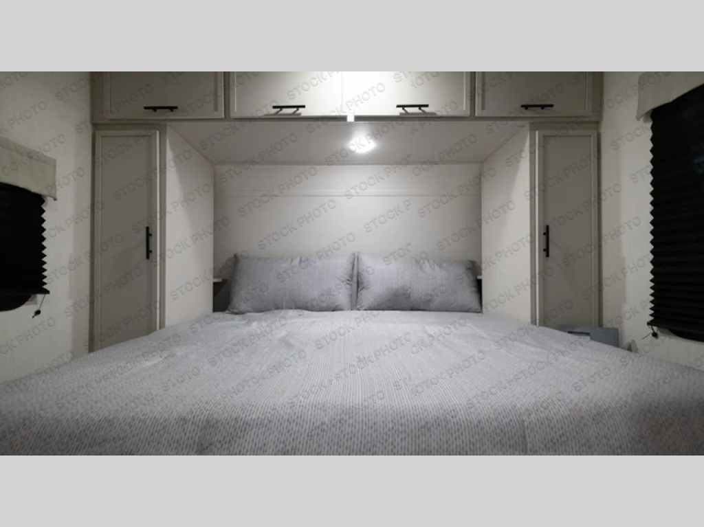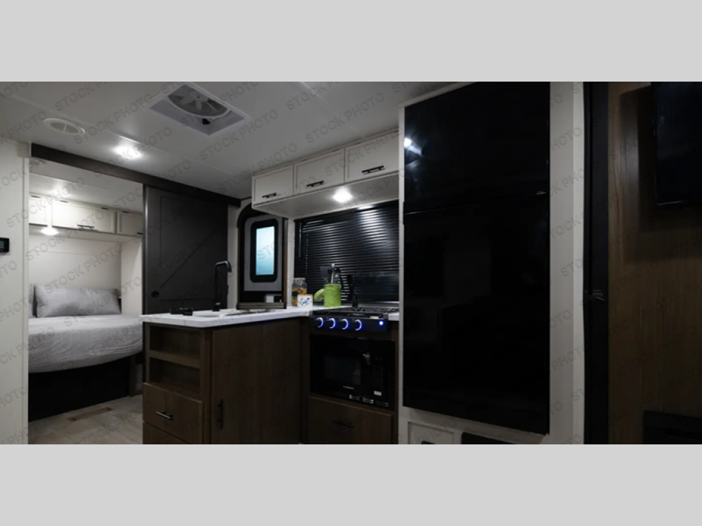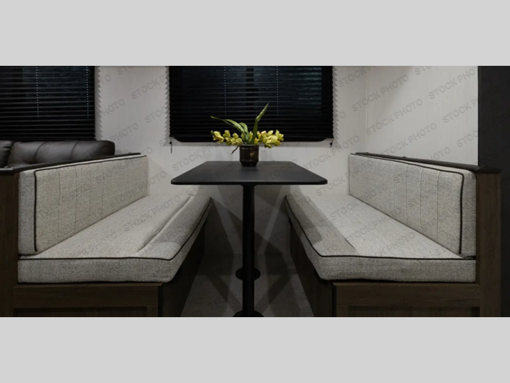 You'll appreciate the added space in this travel trailer thanks to the large slide out! The booth dinette and sofa are found here, and there is a moveable storage ottoman for extra blankets or board games. You'll have your own space up front in the private bedroom, complete with a camp king bed and storage for your things. The chef of your group will find a three burner cooktop and a built-in convection microwave with an air fryer to cook meals, plus there is a 12V refrigerator and hidden pantry for food storage. This unit also includes a power awning outdoors and an outside refrigerator to keep cold drinks close by.