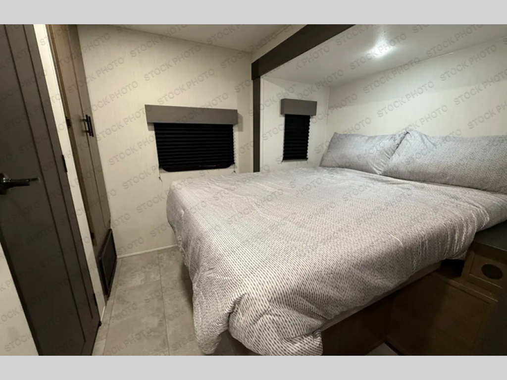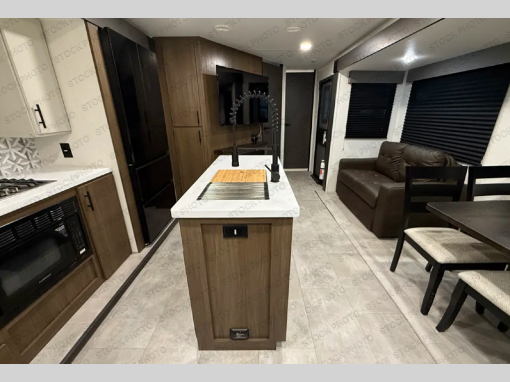 Privacy abounds in this travel trailer with a bedroom at each end! A king bed slide in the front has its own fireplace for cozy nights. Dual wardrobes frame the reading bench which looks out the front window for peaceful moments appreciating the view. At the rear, a second bedroom with queen bed has its own half bath. A pantry closet here also has prep for an optional washer/dryer for convenience on the road. In the center everyone can meet up in the spacious kitchen/living room. A hide-a-bed sofa has even more sleeping space, or relax there and watch the TV which is in the entertainment center along with another fireplace. The kitchen is well-equipped with a three-burner cooktop, microwave, and even an island where the sink is located for easy meal prep. Outside there are not one but two 10' power awnings for extra protection from the elements!
