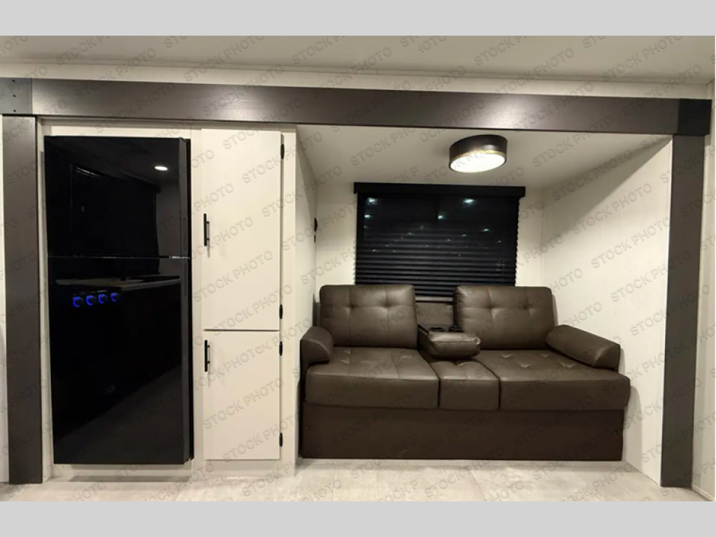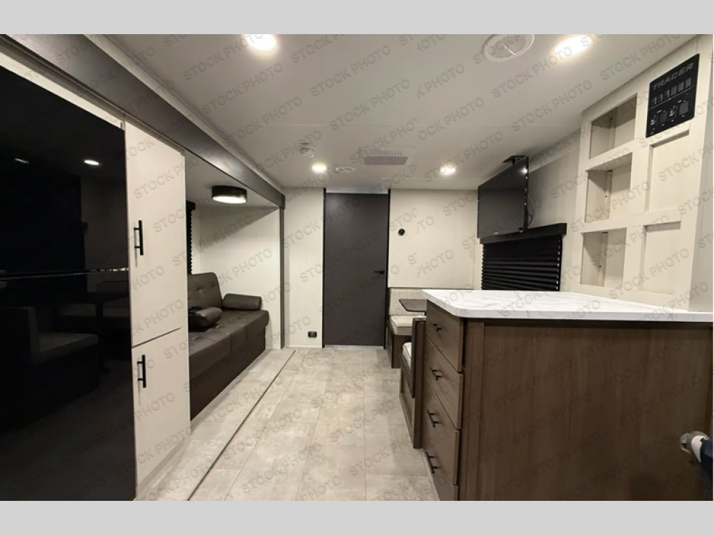 This travel trailer's modern rear kitchen is equipped with a reliable fridge, well-stocked pantry, and stylish hutch, making meal prep and storage a snap. The versatile jackknife sofa provides additional sleeping space or a cozy spot to unwind, while the intimate booth dinette is perfect for sharing meals or stories with loved ones. The crisp high-definition smart TV is ideal for entertainment on the go, and the practical walk-thru bathroom provides easy access. The serene front bedroom is a peaceful retreat, featuring a comfortable king bed, functional linen closet, spacious wardrobes, and ample overhead cabinets for storing your essentials. One of the standout features of this trailer is the two entry/exit doors, providing added convenience and flexibility.