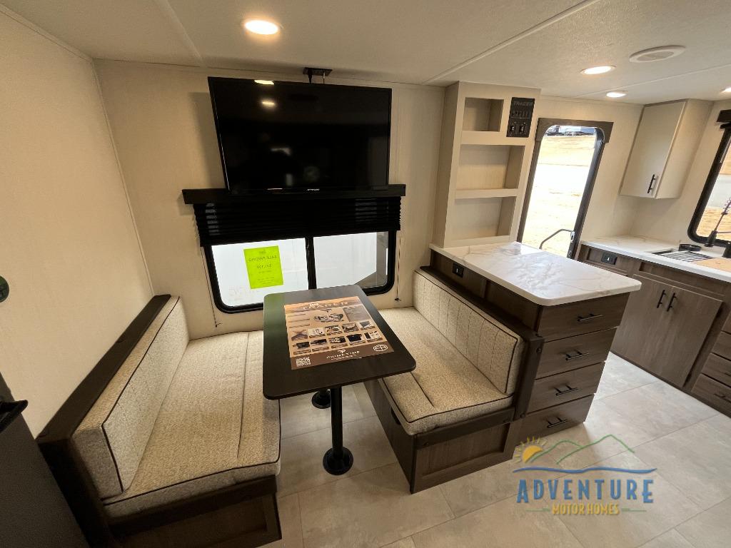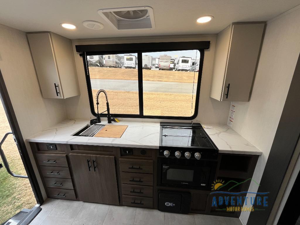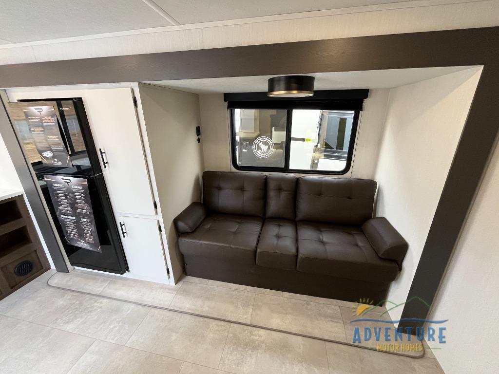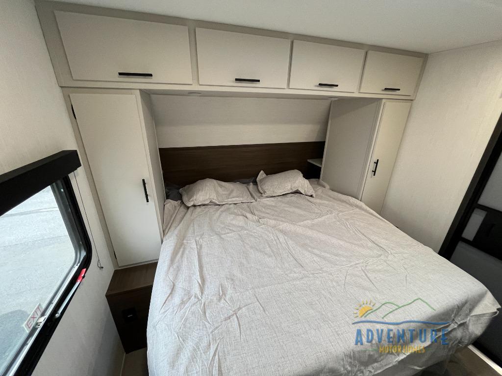 This travel trailer's modern rear kitchen is equipped with a reliable fridge, well-stocked pantry, and stylish hutch, making meal prep and storage a snap. The versatile jackknife sofa provides additional sleeping space or a cozy spot to unwind, while the intimate booth dinette is perfect for sharing meals or stories with loved ones. The crisp high-definition smart TV is ideal for entertainment on the go, and the practical walk-thru bathroom provides easy access. The serene front bedroom is a peaceful retreat, featuring a comfortable king bed, functional linen closet, spacious wardrobes, and ample overhead cabinets for storing your essentials. One of the standout features of this trailer is the two entry/exit doors, providing added convenience and flexibility.