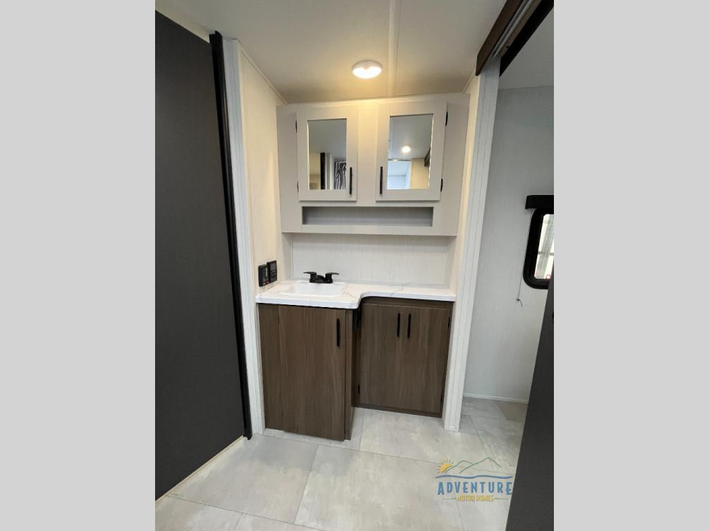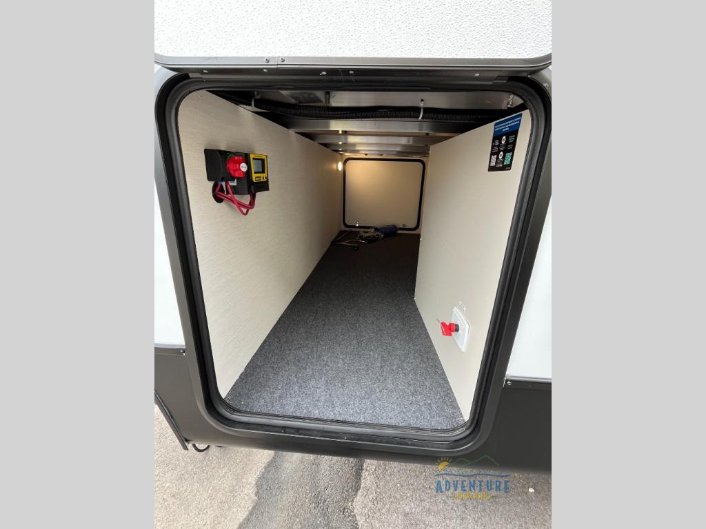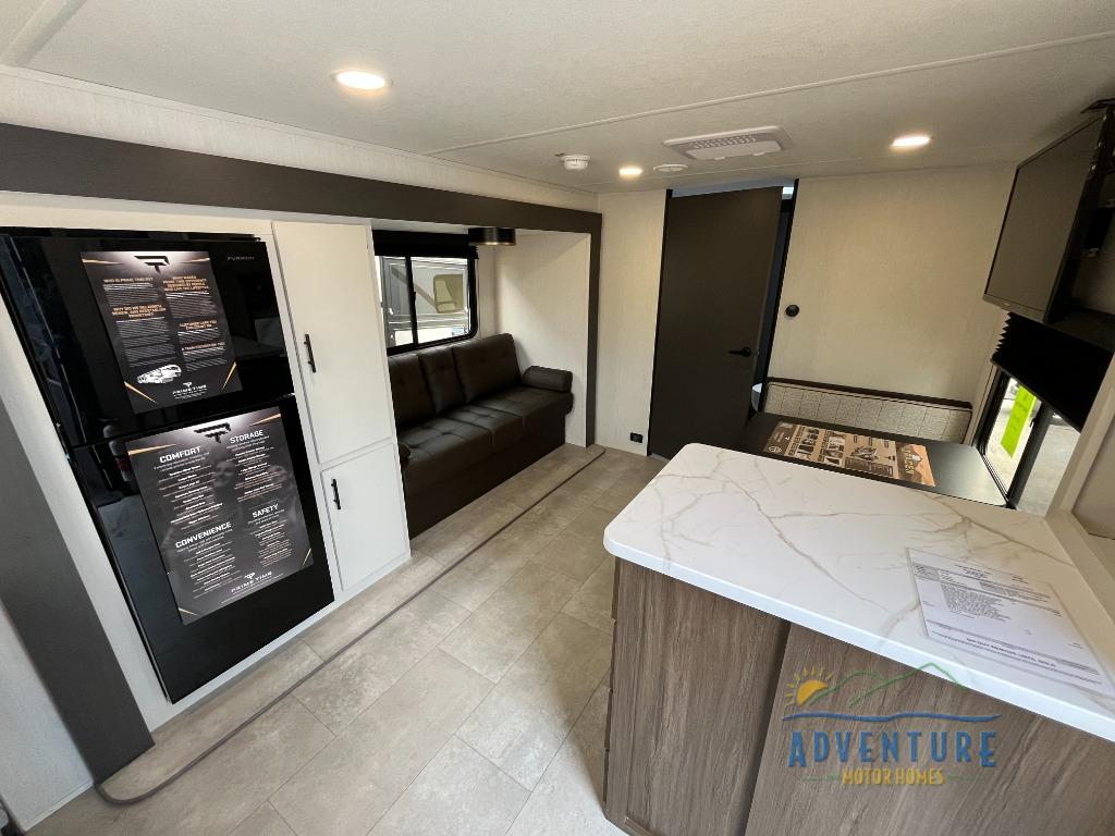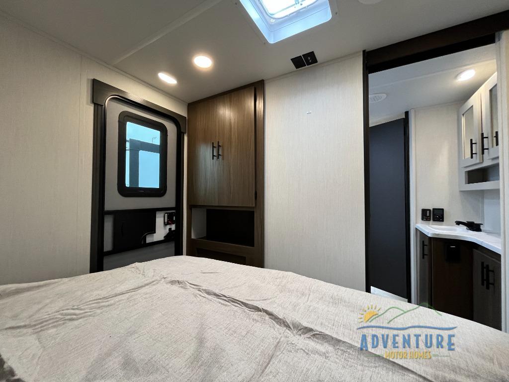 This travel trailer's modern rear kitchen is equipped with a reliable fridge, well-stocked pantry, and stylish hutch, making meal prep and storage a snap. The versatile jackknife sofa provides additional sleeping space or a cozy spot to unwind, while the intimate booth dinette is perfect for sharing meals or stories with loved ones. The crisp high-definition smart TV is ideal for entertainment on the go, and the practical walk-thru bathroom provides easy access. The serene front bedroom is a peaceful retreat, featuring a comfortable king bed, functional linen closet, spacious wardrobes, and ample overhead cabinets for storing your essentials. One of the standout features of this trailer is the two entry/exit doors, providing added convenience and flexibility.
