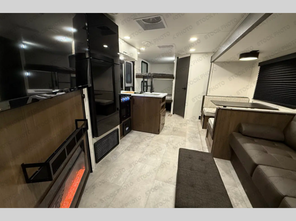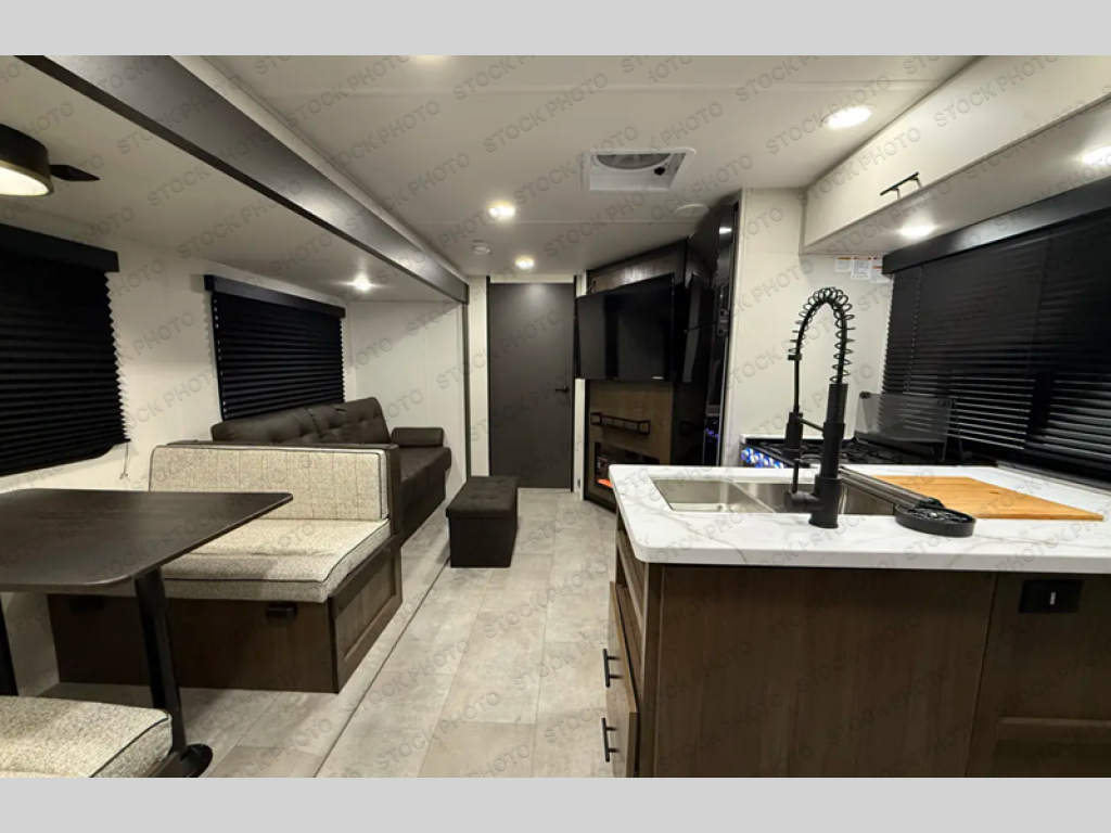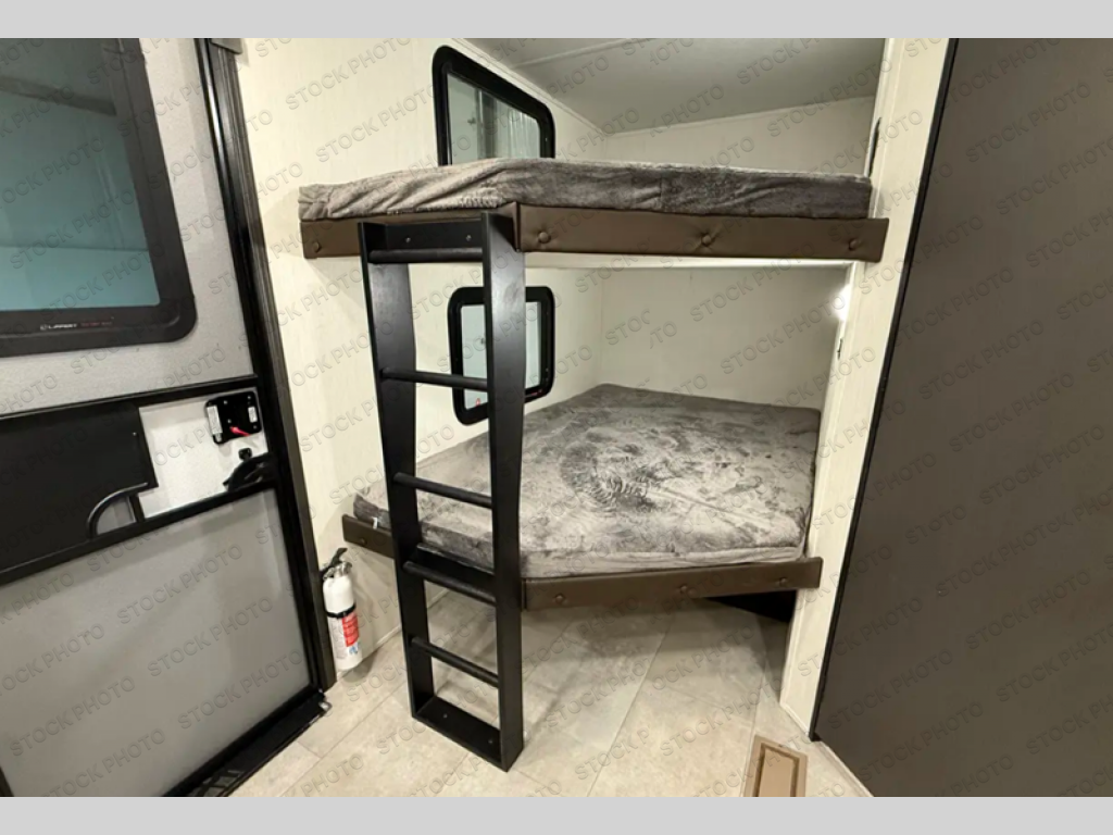If you're looking for more comfort and a larger sleeping capacity in your next RV, this travel trailer is the one! There are double-size bunks in the rear corner, along with a ladder to easily hop into bed, and the full bath is in the other rear corner for easy nighttime use. You'll enjoy the front private bedroom with its queen bed and dual wardrobes for your things, and a separate closet with washer and dryer prep if you choose to add those appliances. And one of the dual entry doors is located here so you can easily slip out in the morning without waking everyone else up in the trailer! In the morning, you can make breakfast in the full kitchen, then dine at the booth dinette within the large slide out. There is also a jack knife sofa here for more comfort. This travel trailer also includes plenty of storage space, including a walk-in pantry with shelves, an additional storage closet, and a pass-thru storage outside for fishing poles!