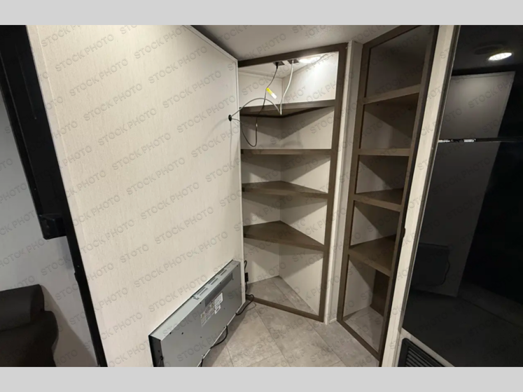 This travel trailer is the best option for a big family! The trailer boasts a spacious bunk bed above a sofa bed, providing ample sleeping space for kids and adults alike. The luxurious front king bed is a serene retreat, featuring expansive wardrobes and overhead cabinets for storing your essentials. The charming booth dinette is a cozy spot for meals or extra sleeping space, as well as the versatile jackknife sofa, which also provides additional sleeping space or a comfortable spot to relax. The sleek entertainment center is perfect for family movie nights. The well-appointed kitchen is equipped with a large fridge, convenient shelves, and a spacious pantry, making meal prep and storage an easy chore. The modern full bathroom features a well-stocked linen closet and provides a convenient space for freshening up. Plus, with two convenient entry/exit doors, this trailer offers added flexibility and ease of use, and the ample overhead cabinets provide additional storage space for your belongings.
