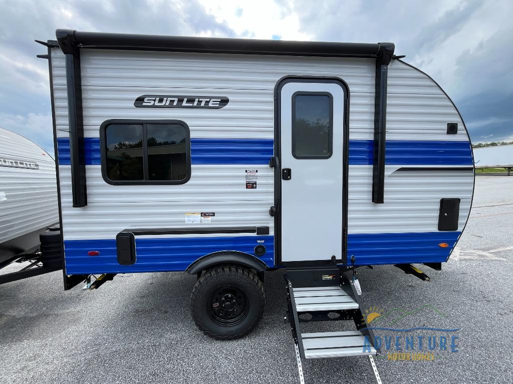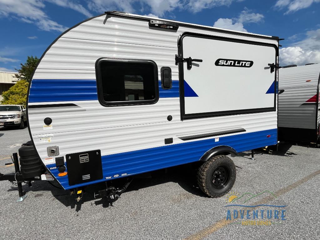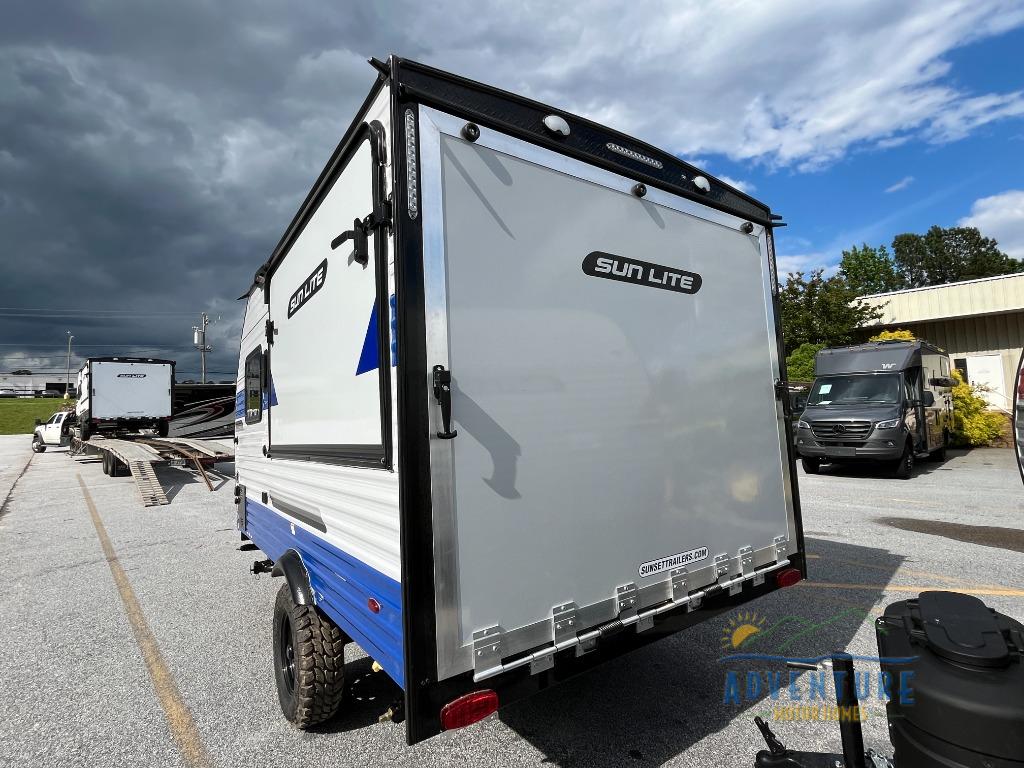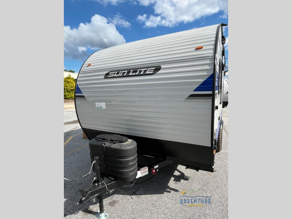 You can trust the build and enjoy your experience with any one of these Sunset Park RV Sun Lite travel trailers or toy haulers! Their aerodynamic profile is not only easy to haul, but also saves on fuel. They are built to withstand years of traveling even though they are lightweight with a diamond plate rock guard, a one piece PVC roof membrane, Dexter Spring-Leaf axles, and tinted safety glass windows. Some comfort standards you are sure to enjoy are the two-burner stove top range with hood, light and fan, plus the refrigerator and microwave, and an outside shower to help keep the dirt outdoors where it belongs.