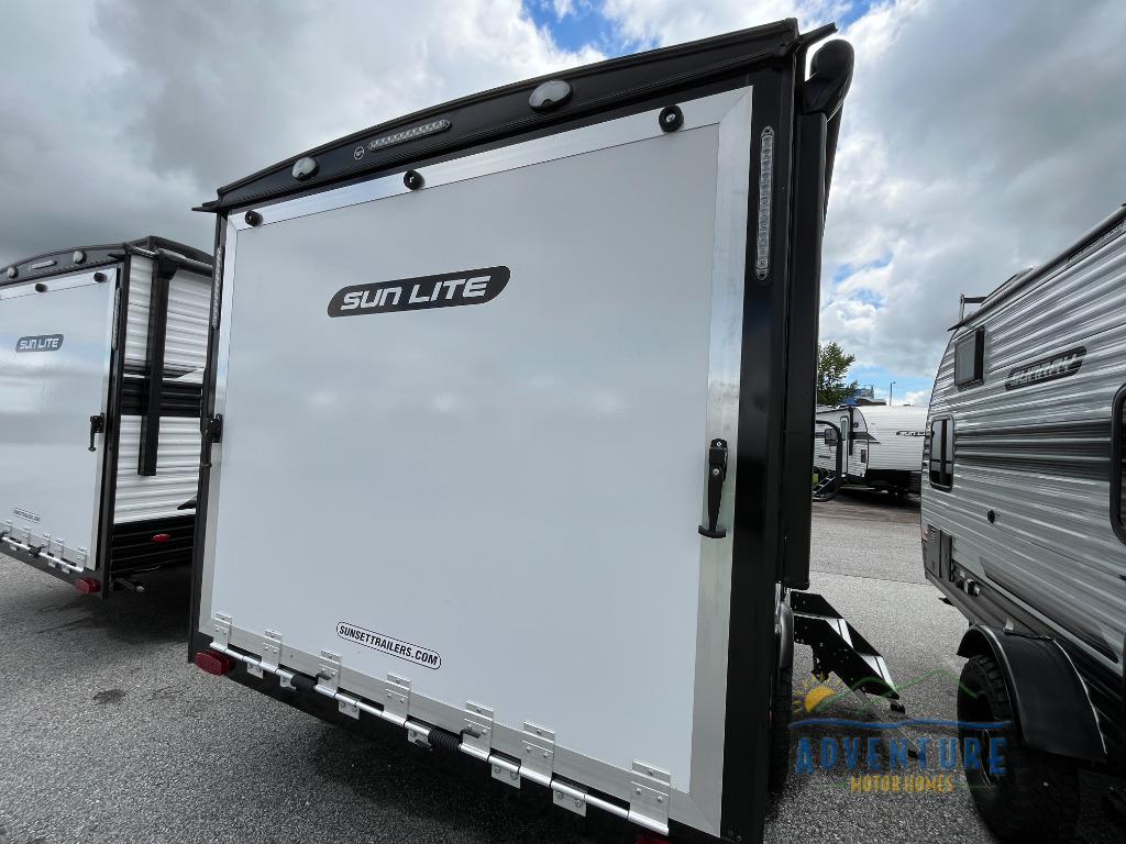 You can trust the build and enjoy your experience with any one of these Sunset Park RV Sun Lite travel trailers or toy haulers! Their aerodynamic profile is not only easy to haul, but also saves on fuel. They are built to withstand years of traveling even though they are lightweight with a diamond plate rock guard, a one piece PVC roof membrane, Dexter Spring-Leaf axles, and tinted safety glass windows. Some comfort standards you are sure to enjoy are the two-burner stove top range with hood, light and fan, plus the refrigerator and microwave, and an outside shower to help keep the dirt outdoors where it belongs.